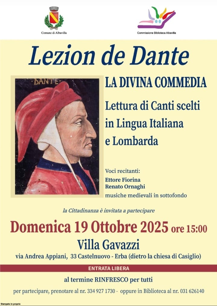 ALBAVILLA – Il Comune di Albavilla e la Commissione Biblioteca Albavilla invitano tutta la cittadinanza a un appuntamento culturale imperdibile: “Lezion de Dante – La Divina Commedia”, una lettura di canti scelti del capolavoro dantesco in lingua italiana e lombarda.
