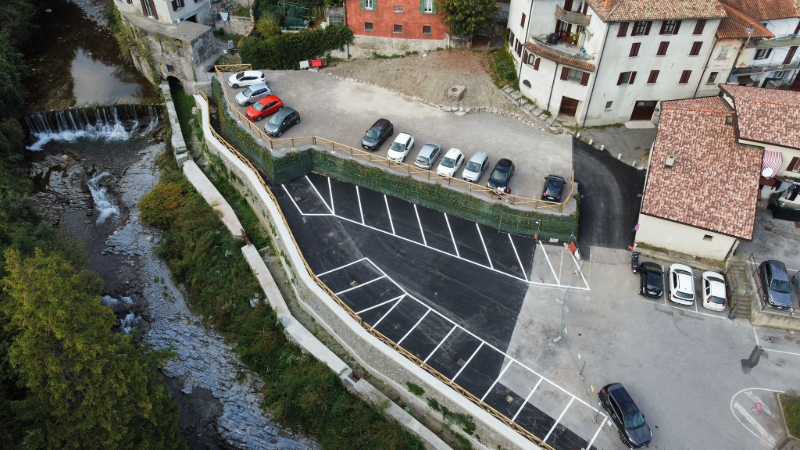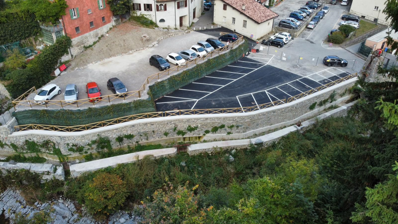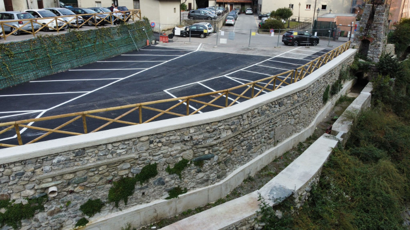 È stato rifatto il muro di monte a sostegno del parcheggio pubblico in pietra, sempre mediante tecnica “scuci e cuci”, con formazione di un banchettone di calcestruzzo armato vincolato a micropali. Si è poi completato la pulizia del canale di derivazione (rimozione piante e d arbusti infestanti, dragaggio del materiale sedimentato) e posa di pavimentazione in pietra locale e calcestruzzo. Infine si è formato un manufatto in calcestruzzo armato a costituire muro di sostegno su micropali in corrispondenza degli spazi destinati a parcheggio pubblico sostenuti dai manufatti arginali in pietra.