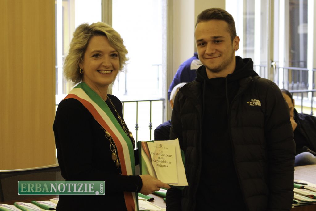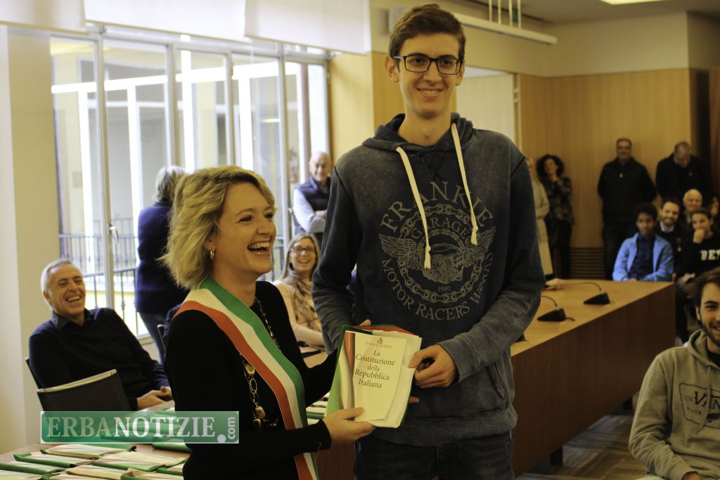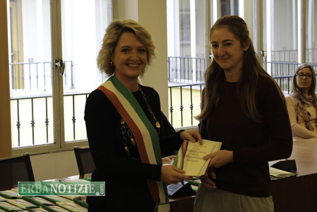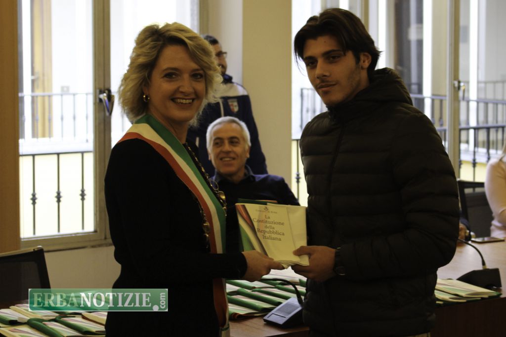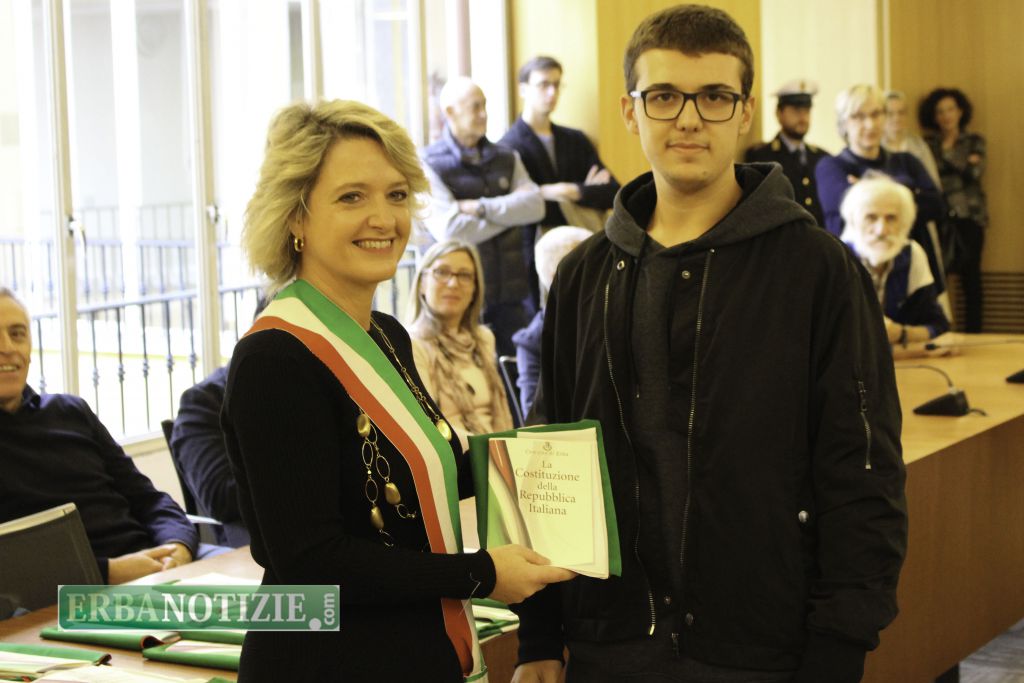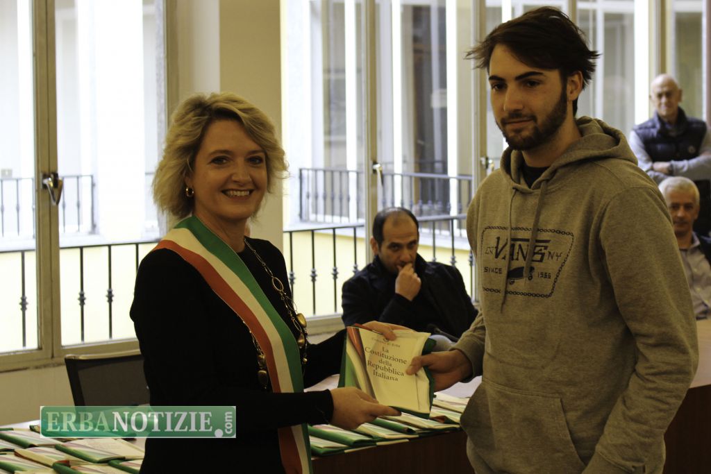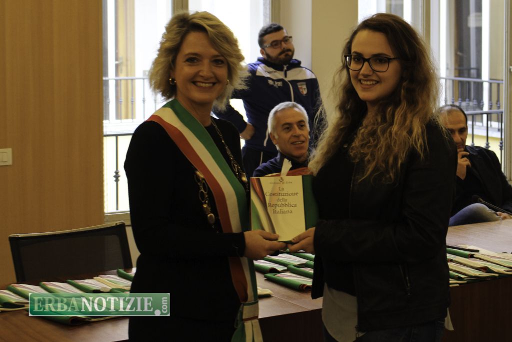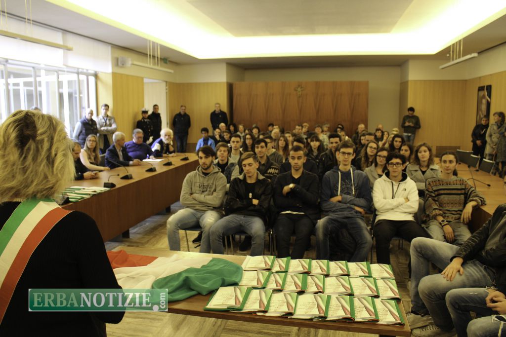 ERBA – Diciottenni erbesi protagonisti nella giornata di sabato 4 novembre, in occasione dei festeggiamenti per l’Unità Nazionale e delle Forze Armate. In tarda mattinata presso la Sala Consiglio del comune di Erba si è svolta la consegna della Costituzione e della bandiera italiana da parte del sindaco, Veronica Airoldi, ai neo diciottenni.