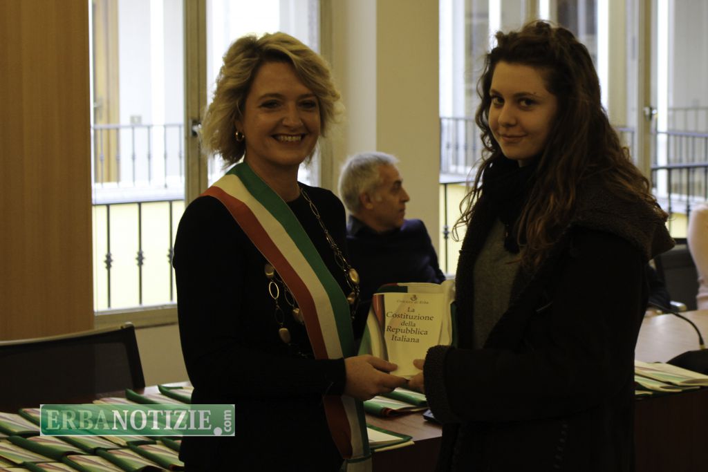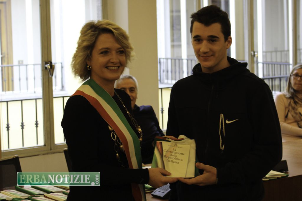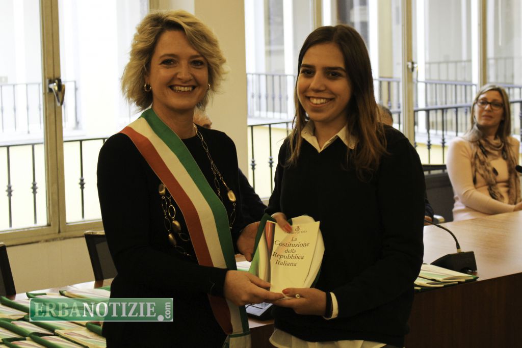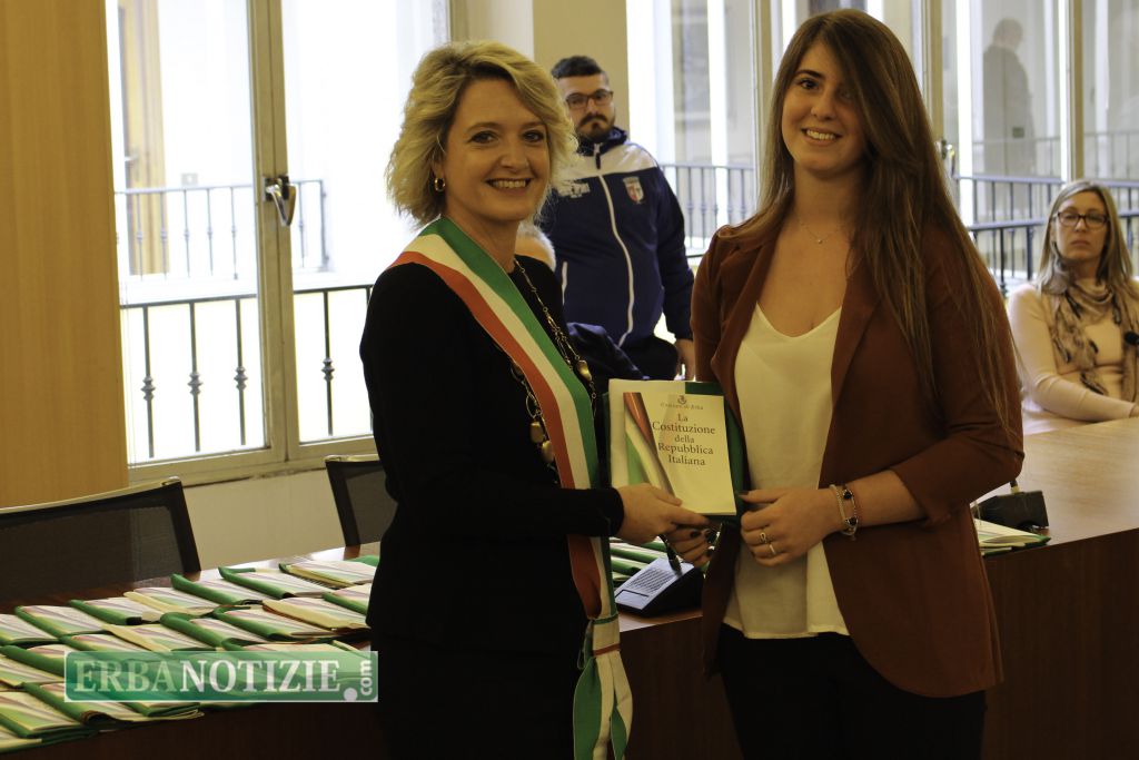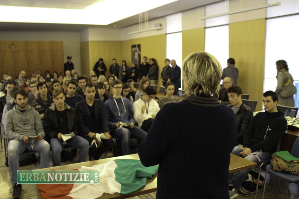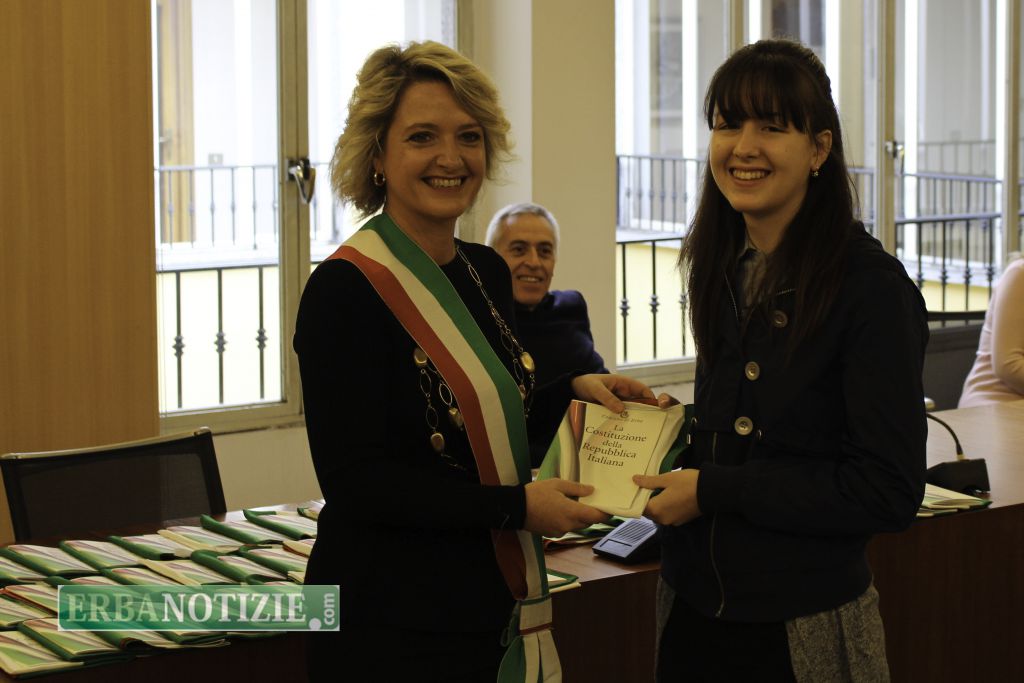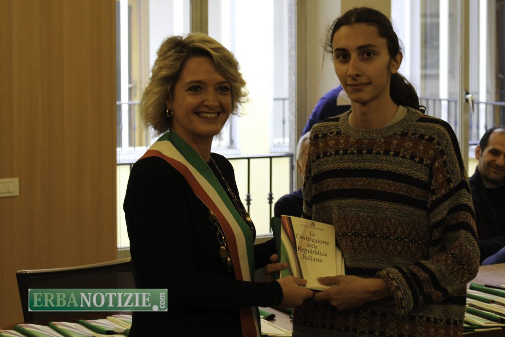 ERBA – Diciottenni erbesi protagonisti nella giornata di sabato 4 novembre, in occasione dei festeggiamenti per l’Unità Nazionale e delle Forze Armate. In tarda mattinata presso la Sala Consiglio del comune di Erba si è svolta la consegna della Costituzione e della bandiera italiana da parte del sindaco, Veronica Airoldi, ai neo diciottenni.