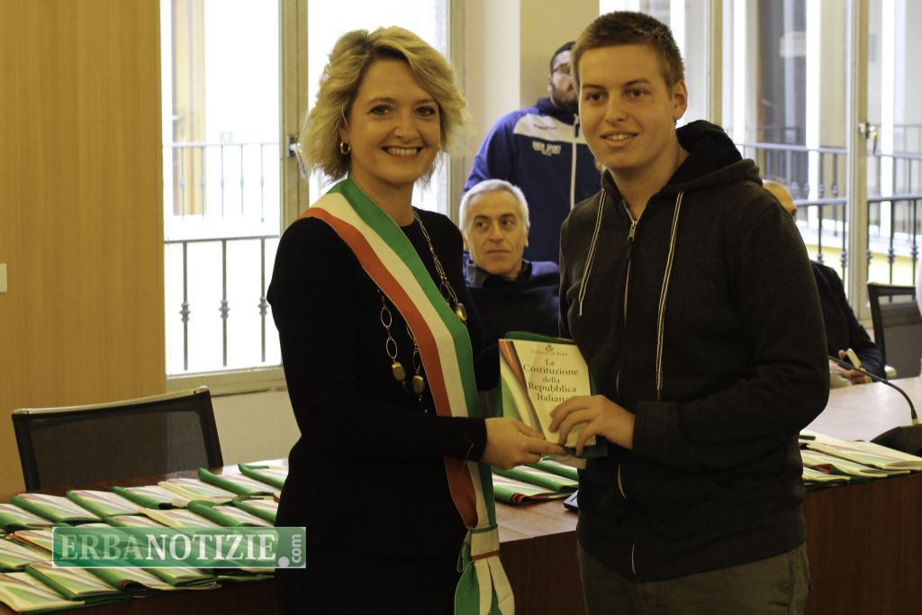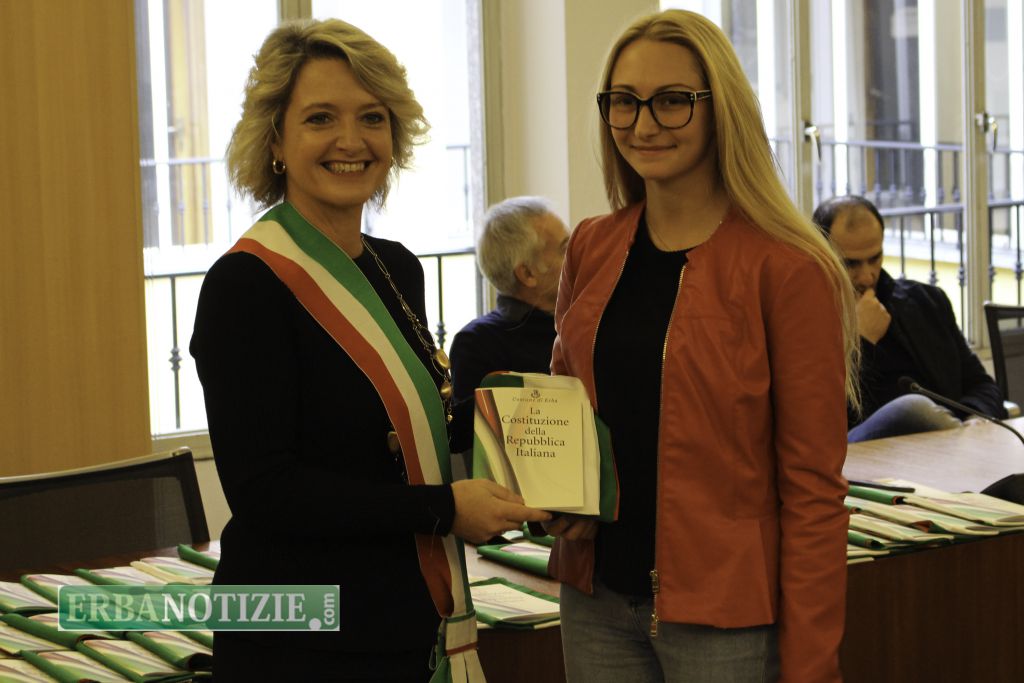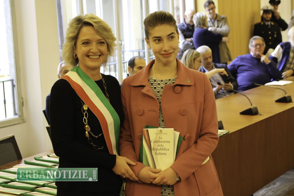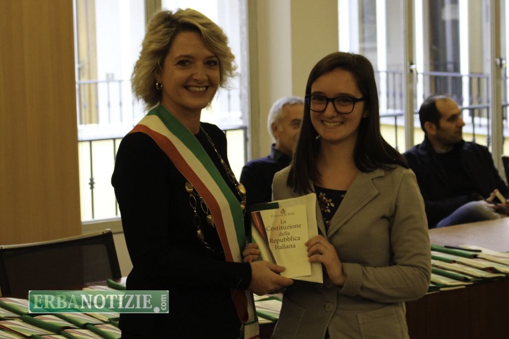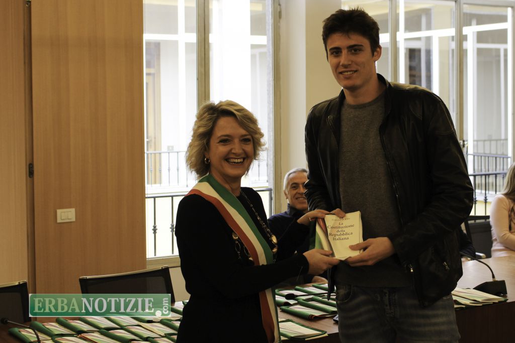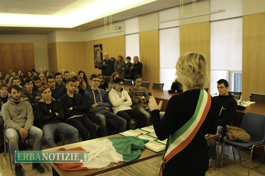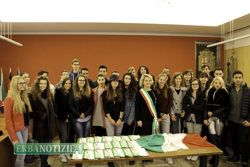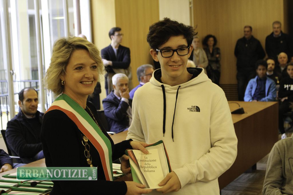 ERBA – Diciottenni erbesi protagonisti nella giornata di sabato 4 novembre, in occasione dei festeggiamenti per l’Unità Nazionale e delle Forze Armate. In tarda mattinata presso la Sala Consiglio del comune di Erba si è svolta la consegna della Costituzione e della bandiera italiana da parte del sindaco, Veronica Airoldi, ai neo diciottenni.