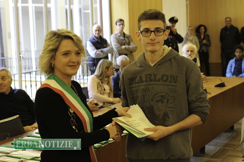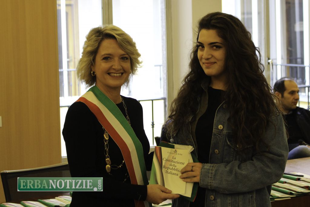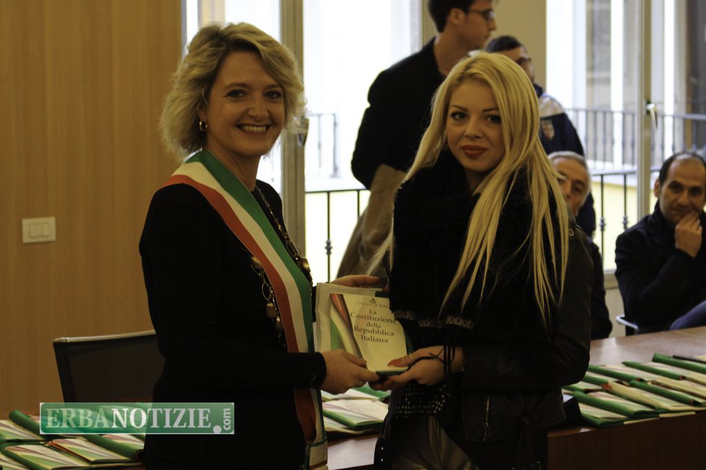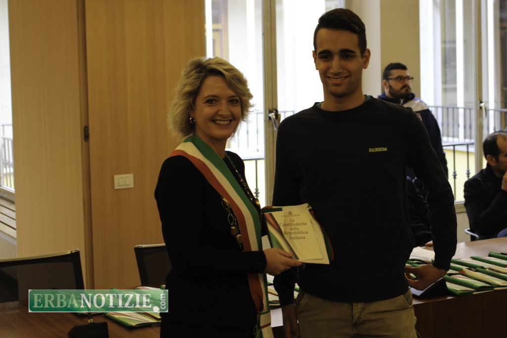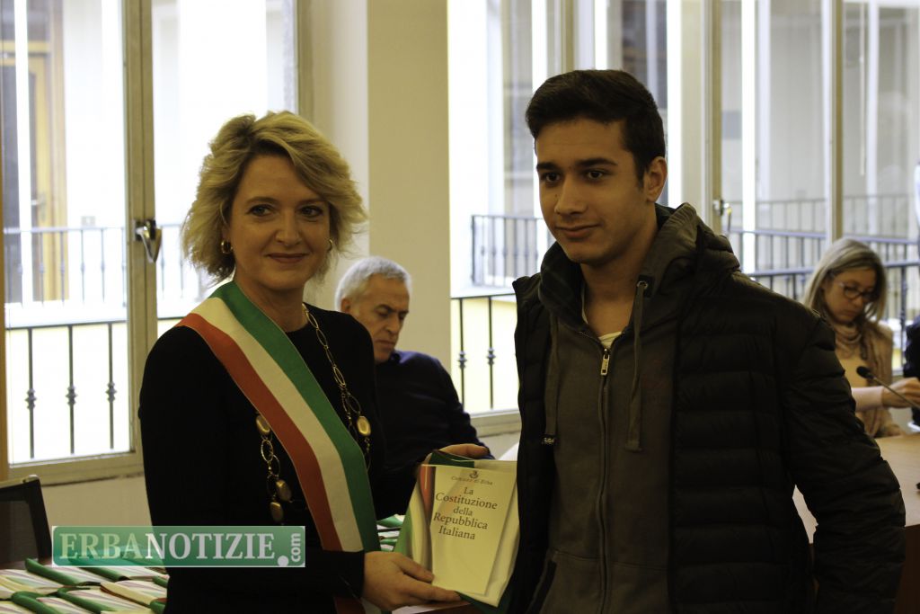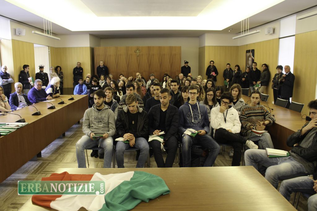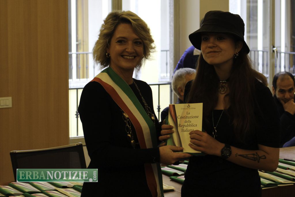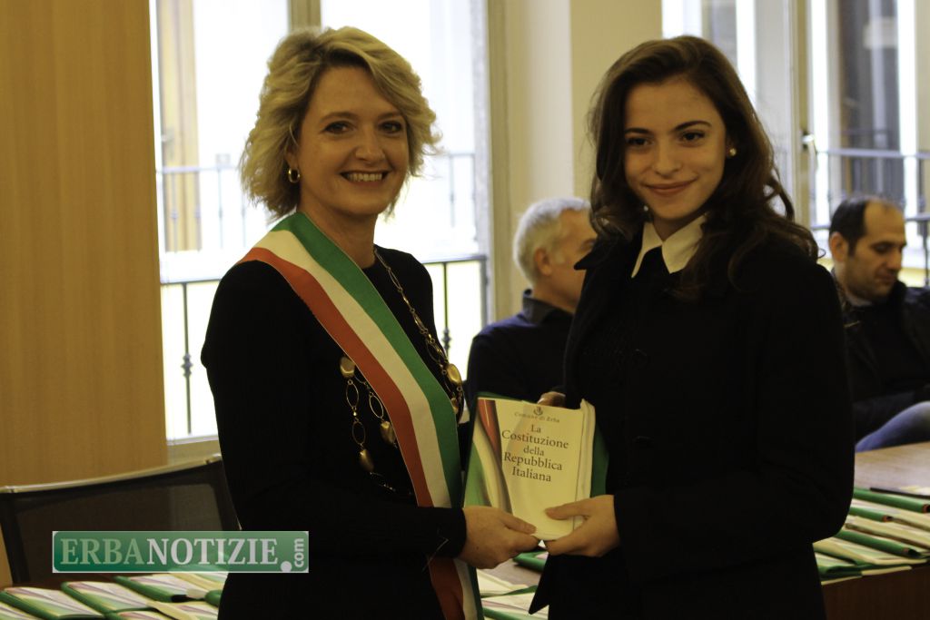 ERBA – Diciottenni erbesi protagonisti nella giornata di sabato 4 novembre, in occasione dei festeggiamenti per l’Unità Nazionale e delle Forze Armate. In tarda mattinata presso la Sala Consiglio del comune di Erba si è svolta la consegna della Costituzione e della bandiera italiana da parte del sindaco, Veronica Airoldi, ai neo diciottenni.