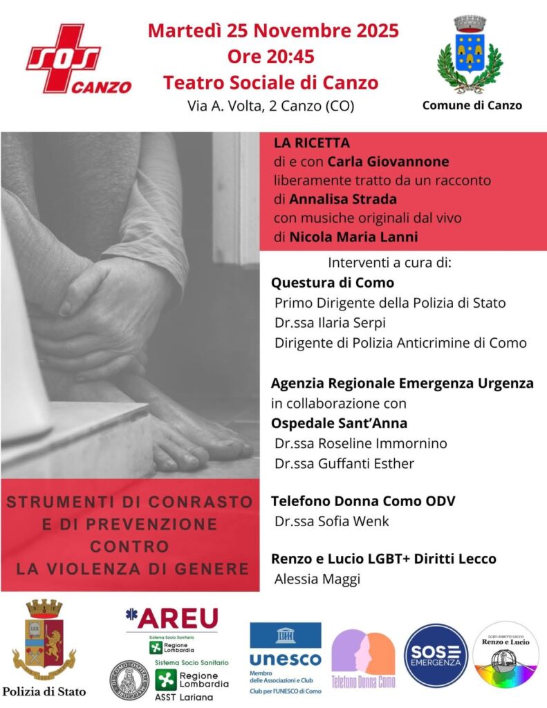 CANZO – Il Teatro Sociale di Canzo ospiterà un appuntamento che riunisce istituzioni, sanità e associazioni intorno a un tema cruciale: il contrasto alla violenza di genere. L’iniziativa, organizzata da SOS Canzo con il patrocinio del Comune di Canzo, è fissata per martedì 25 novembre 2025 alle ore 20.45 in via A. Volta 2 e propone un format che combina interventi professionali e narrazione teatrale.
