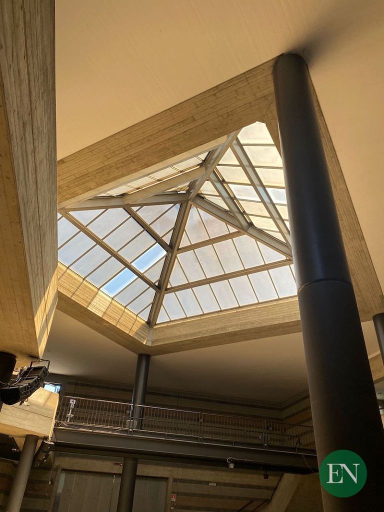 L’ingresso del centro espositivo sarà ritinteggiato e si sta valutando la realizzazione di un corridoio di luce – con vetrate – che riprenda l’onda dell’arena centrale, segnando l’accesso alla fiera.