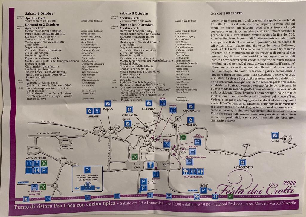 Per i primi due fine settimana di ottobre i tipici Crotti del paese, saranno aperti al pubblico per visite e degustazioni, ma non solo: la festa anima un intero paese con iniziative per grandi e piccoli e non manca di attrarre tanti visitatori da fuori.