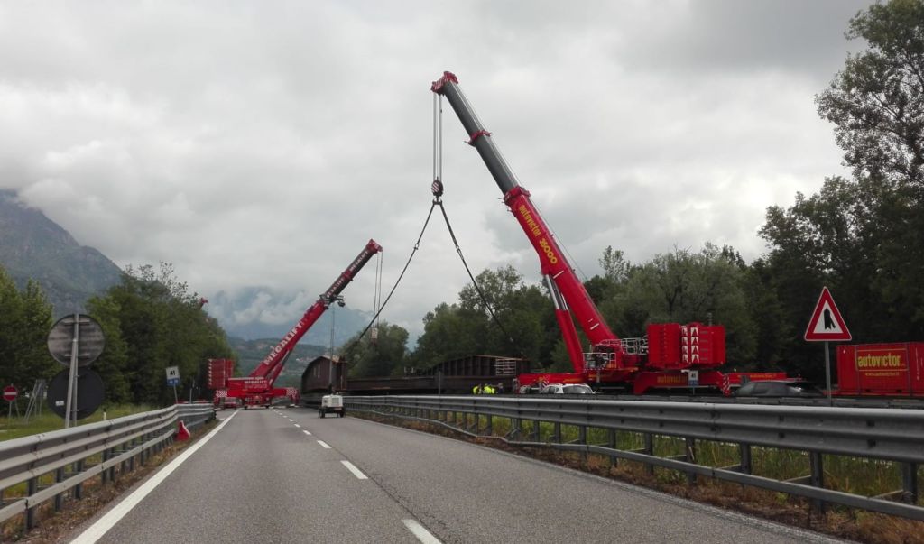 Nella giornata di oggi le gru alzeranno il manufatto, dal peso di 250 tonnellate, per collocarlo nella posizione opportuna all’alzata finale, quando l’impalcato sarà sollevato sopra la SS36 e adagiato sulle spalle del vecchio ponte.