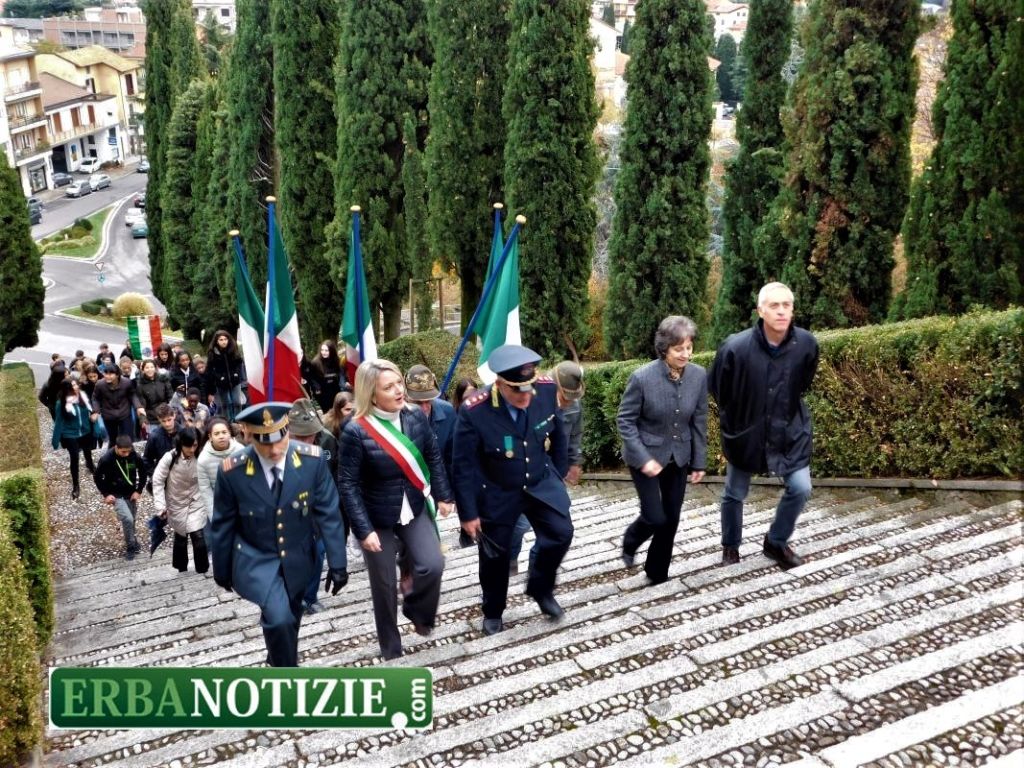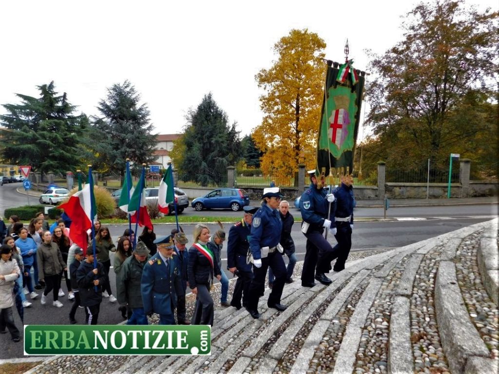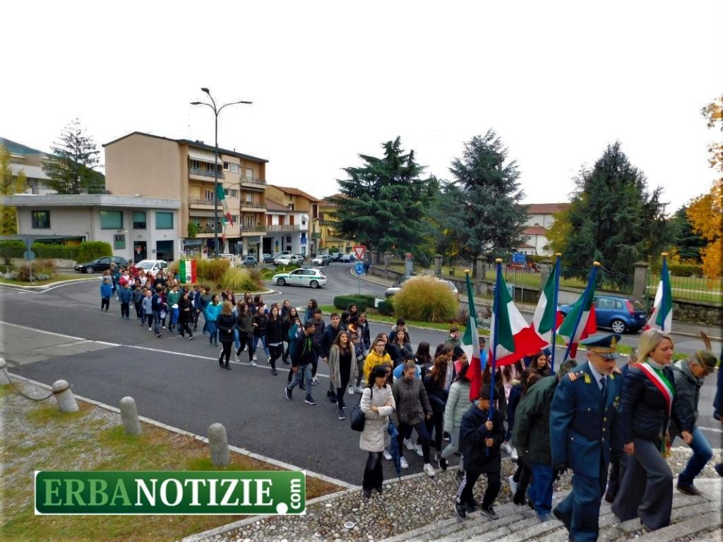 ERBA – “Per quelli che furono, per quelli che sono, per quelli che saranno”. Mai come oggi, mercoledì, questa frase, scritta sul fregio del monumento ai caduti di Erba, sembra vera: gli alunni delle scuole medie degli istituti erbesi si sono uniti in un lungo corteo che dalla piazza del Municipio li ha portati fino al monumento per ricordare il centesimo anniversario della fine della Grande Guerra. Con loro, il sindaco Veronica Airoldi.