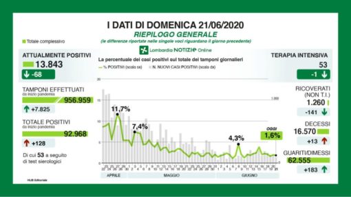COMO – “Su 128 casi positivi registrati oggi, 53 derivano da tampone a seguito di positivita’ al test sierologico. Mentre 51 risultano debolmente positivi. Notizie incoraggianti arrivano dal numero dei pazienti ricoverati, comunicato dal coordinamento della rete ospedaliera lombarda: 53 in terapia intensiva, (1 meno di ieri), 1260 nei reparti di degenza (141 meno di ieri). I decessi sono stati 13”. Cosi’ l’assessore regionale al Welfare, Giulio Gallera, commenta i dati di oggi domenica 21 giugno.