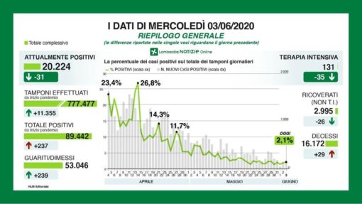 giornalieri). 10 i casi in provincia di Lecco. Ecco i dati di oggi, mercoledì 3 giugno.