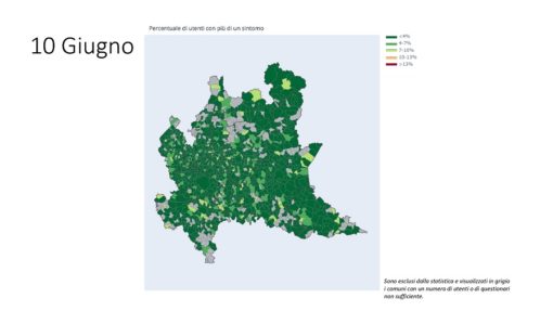 Durante la diretta il vicepresidente ha anche illustrato i grafici elaborati in base agli esiti dei questionari compilati dai cittadini lombardi che partecipano al progetto ‘CercaCovid’. La diffusione del contagio, in base ai sintomi indicati da chi aggiorna il questionario, risulta ancora critica all’inizio del mese di aprile, subisce un decremento in maggio e cala ulteriormente in giugno.
