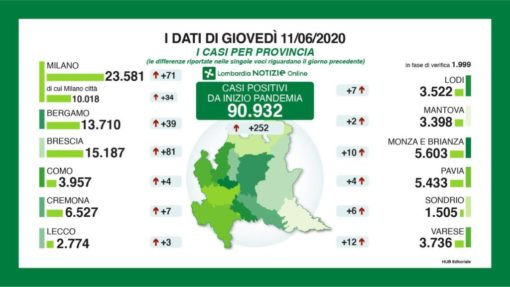 COMO – 252 nuovi casi positivi in Regione Lombardia, per un totale di 90.932 malati. Ecco il bollettino della giornata di oggi, 11 giugno.