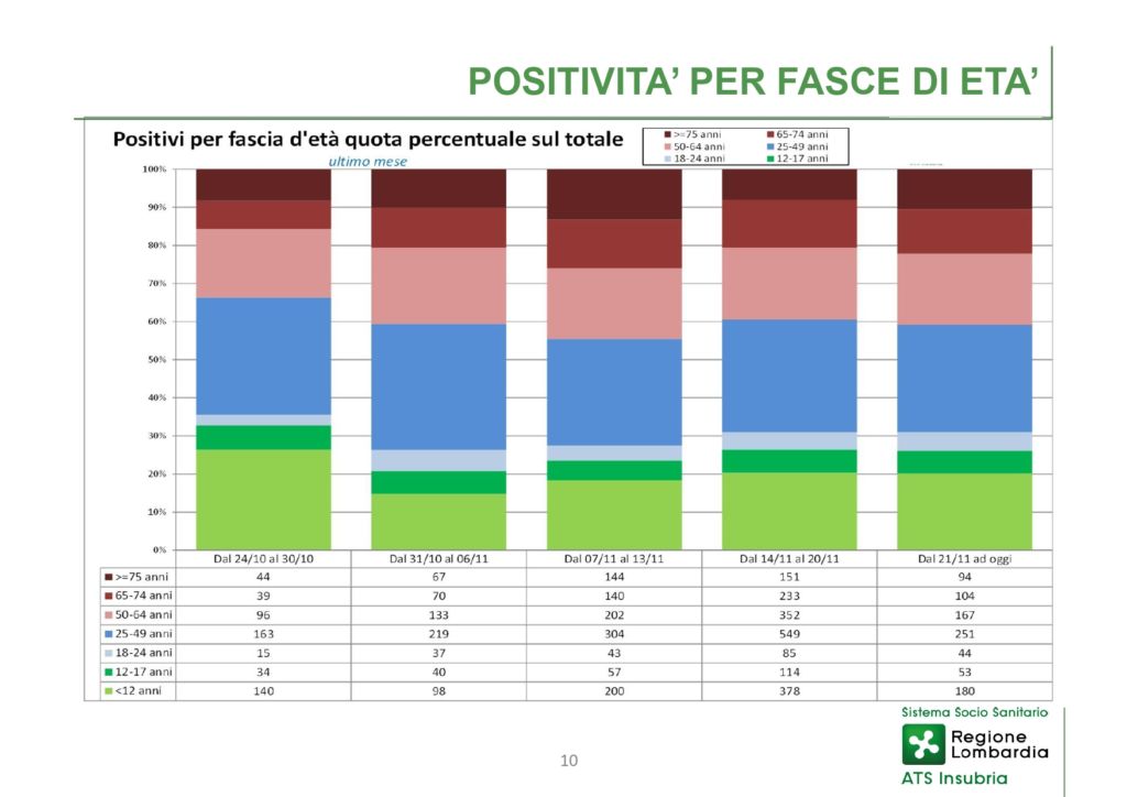 Andando poi a guardare l’andamento dei nuovi positivi suddiviso in generazioni, nell’area di competenza di Ats Insubria si registrano 251 casi nella fascia d’età tra i 25 e i 49 anni, seguito dai 180 degli under 12, i 167 tra i 50 e i 64 anni, i 104 tra i 65 e i 74 anni.