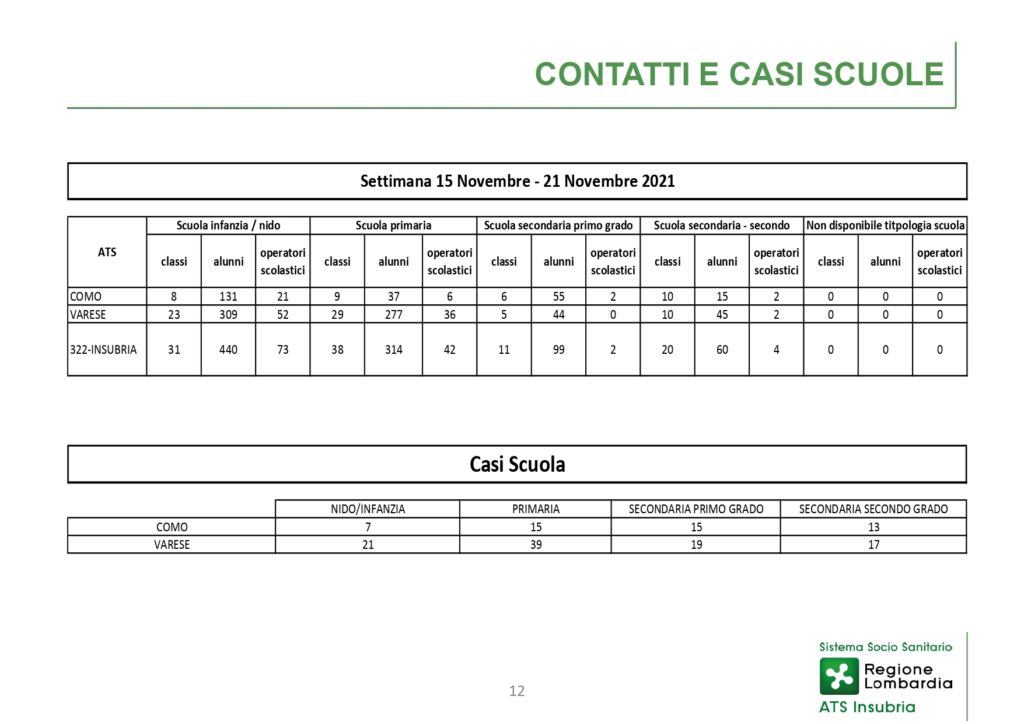 Per quanto riguarda l’ambiente scolastico, in un periodo monitorato fino al 21 novembre, ecco le classi, negli istituti di diverso ordine e grado, in cui sono stati riscontrati i positivi e sono state messe in quarantena nel comasco.
