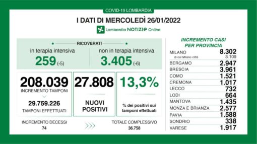 Covid. I dati del 26 gennaio, 27.808 nuovi casi, 1.521 nel comasco