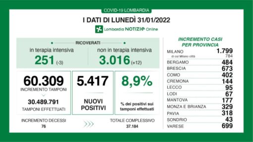 COMO – Diminuiscono i ricoverati in terapia intensiva (-3). A fronte di 60.309 tamponi effettuati, sono 5.417 i nuovi positivi (8,9%).