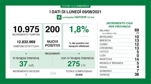 Covid. I dati del 9 agosto: 200 i nuovi positivi, 12 a Como