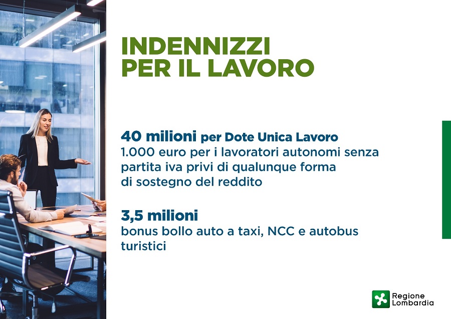 “Nella logica della complementarietà – rimarca il presidente Fontana – abbiamo previsto una misura per i lavoratori autonomi senza partita IVA, privi di qualunque forma di sostegno del reddito, rimasti totalmente esclusi da ogni forma di ristoro degli ultimi provvedimenti governativi. A questa platea, prevediamo di erogare un contributo di 1.000 euro attraverso la loro partecipazione al nostro sistema di politiche attive regionali della Dote Unica Lavoro (DUL)”.