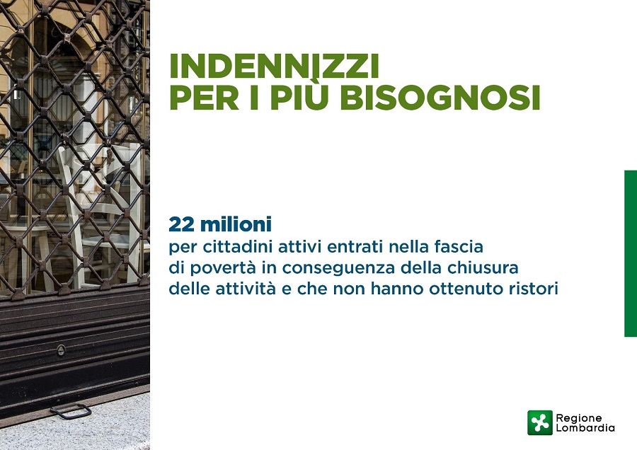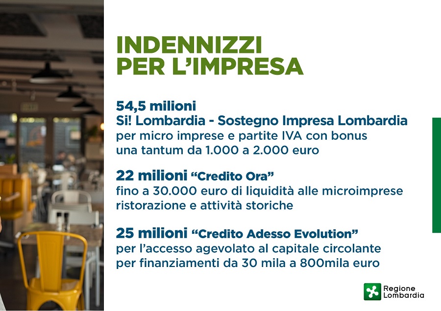 “Alle micro imprese della ristorazione e per le storiche attività – spiega il presidente Fontana – abbiamo previsto una misura di sostegno all’accesso alla liquidità fino a 30.000 euro, mediante un contributo a fondo perduto per l’abbattimento tassi nei limiti del 3%. La misura si chiama ‘Credito Ora’ e lo stanziamento complessivo ammonta a 22 milioni di euro”.