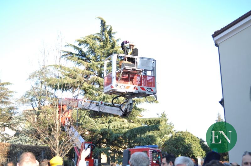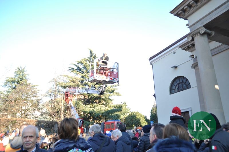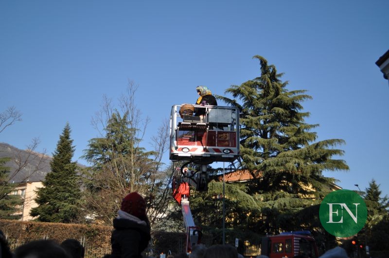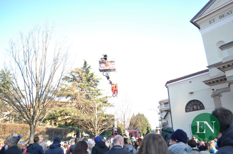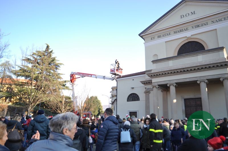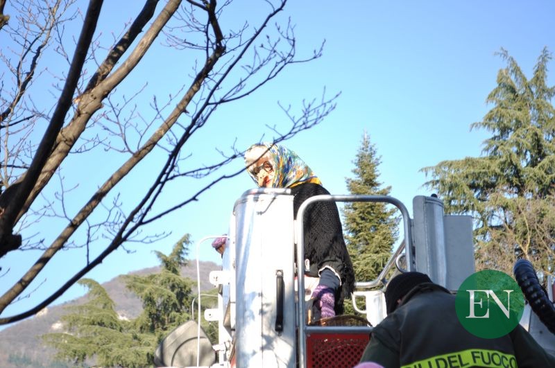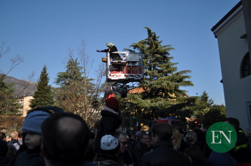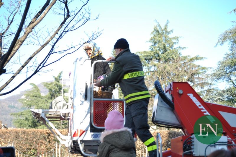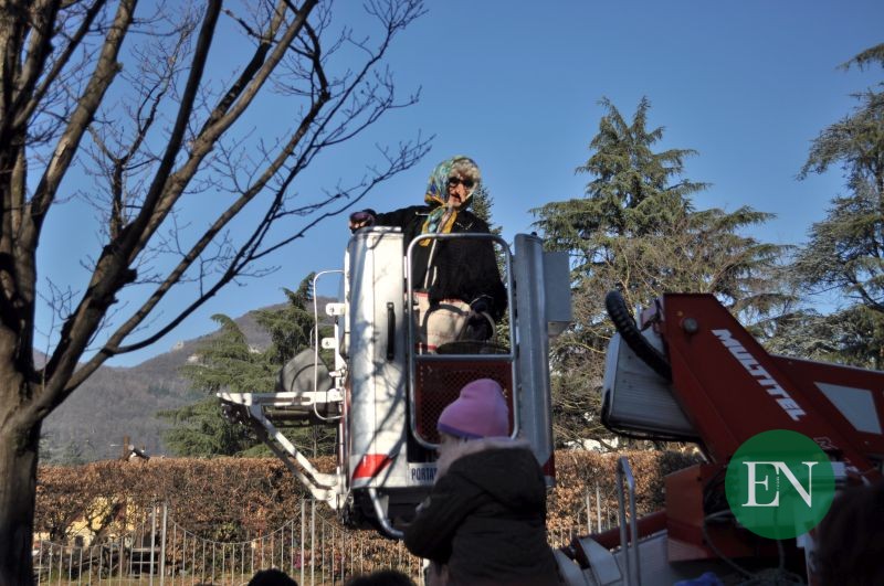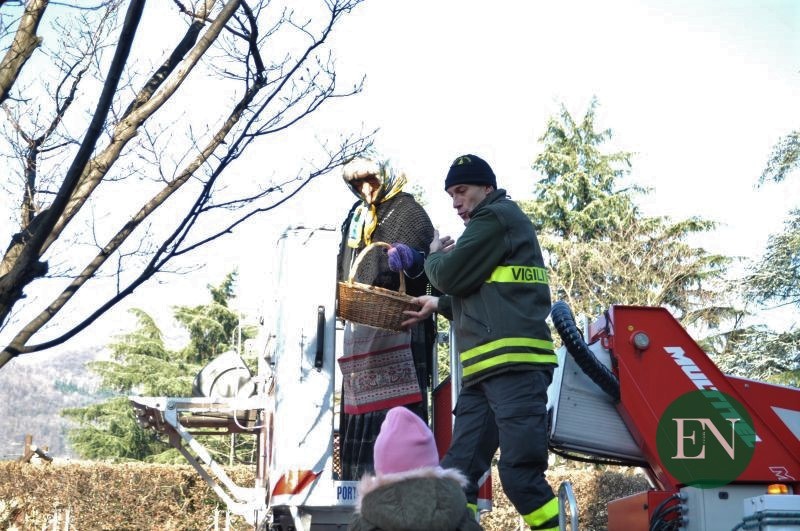 Al termine della messa delle ore 10, tutti sulla Piazza della Prepositura a naso in su: come vuole infatti la tradizione erbese, la simpatica vecchina è salita sul cestello elevatore dei pompieri per distribuire a tutti i presenti dolciumi e caramelle.