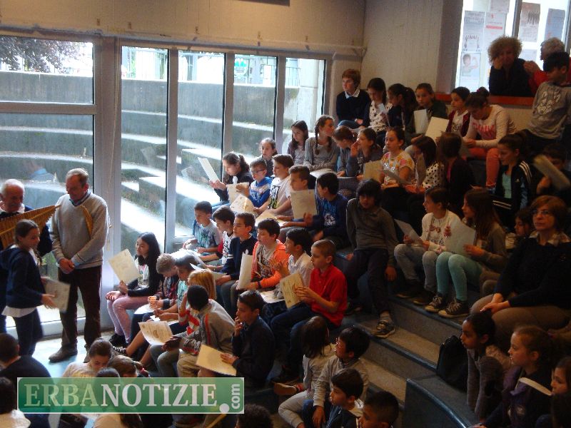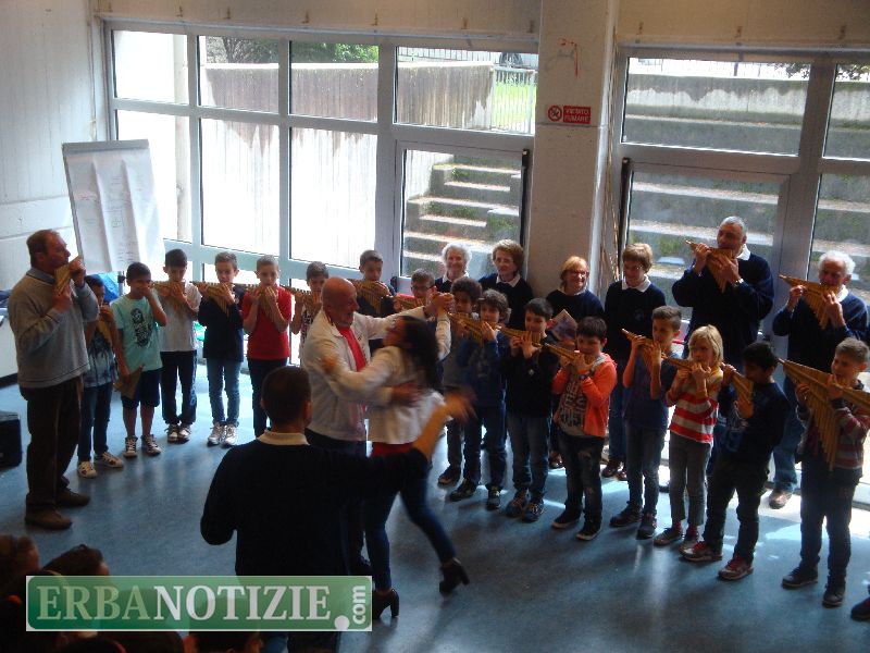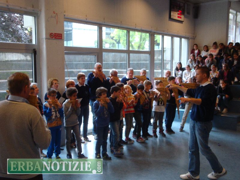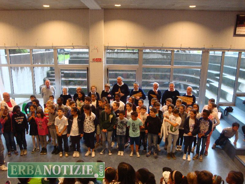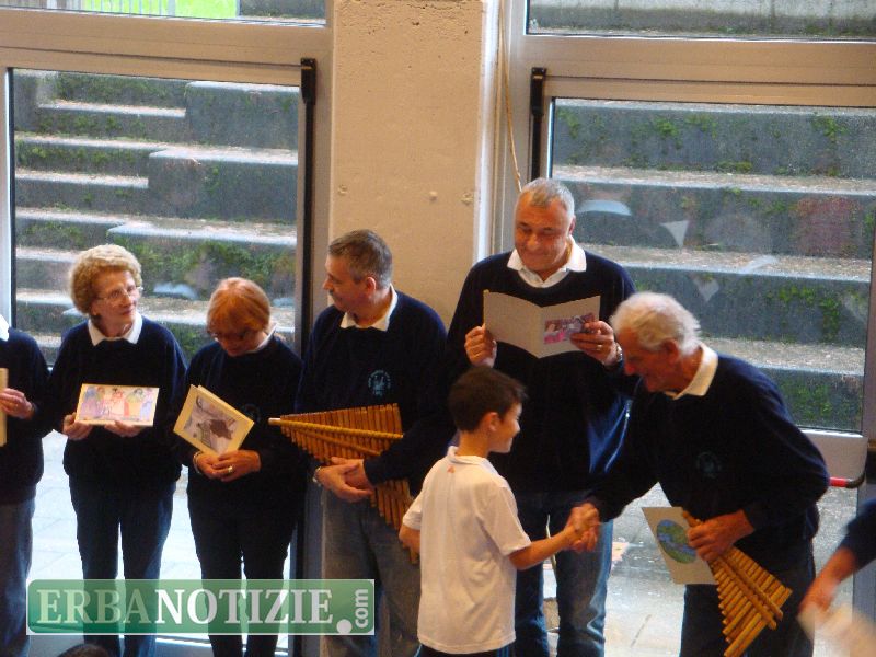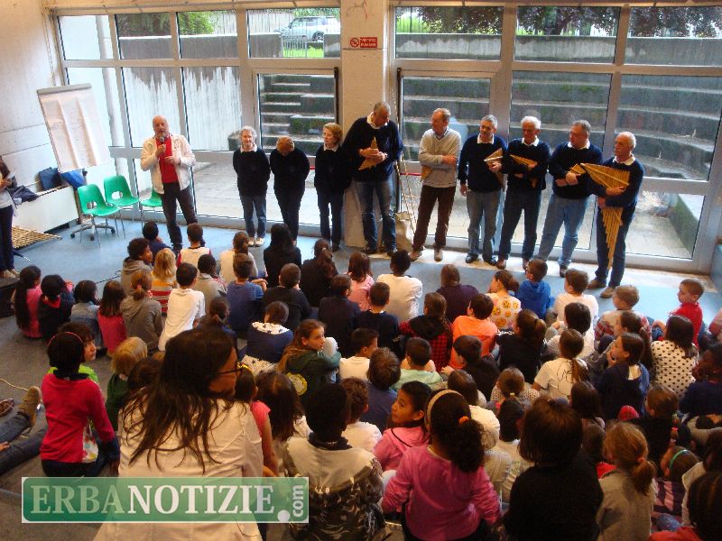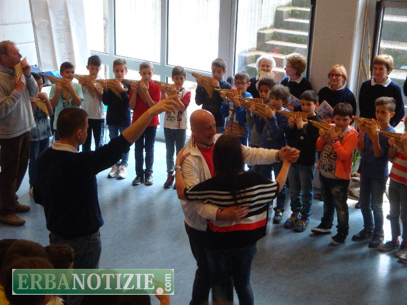 ERBA – Il Maestro Vittorio “Rino” Pozzi, eccelso costruttore di flauti di Pan di Bottanugo (Bg) e Angelo Molinari, presidente del gruppo folcloristico I Bej di Erba, stamattina, lunedì, alla scuola primaria “C. Battisti” hanno premiato con la consegna dei ‘diplomi’ gli alunni delle classi quinte con i quali hanno realizzato lo spettacolo “I Promessi Sposi”, spettacolo con il quale hanno vinto il concorso provinciale Opera Domani e messo in scena al teatro Excelsior di Erba ad aprile e al teatro sociale di Como a maggio.