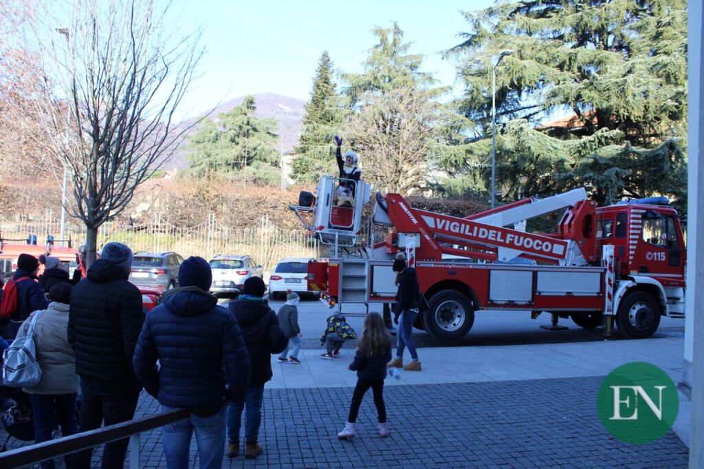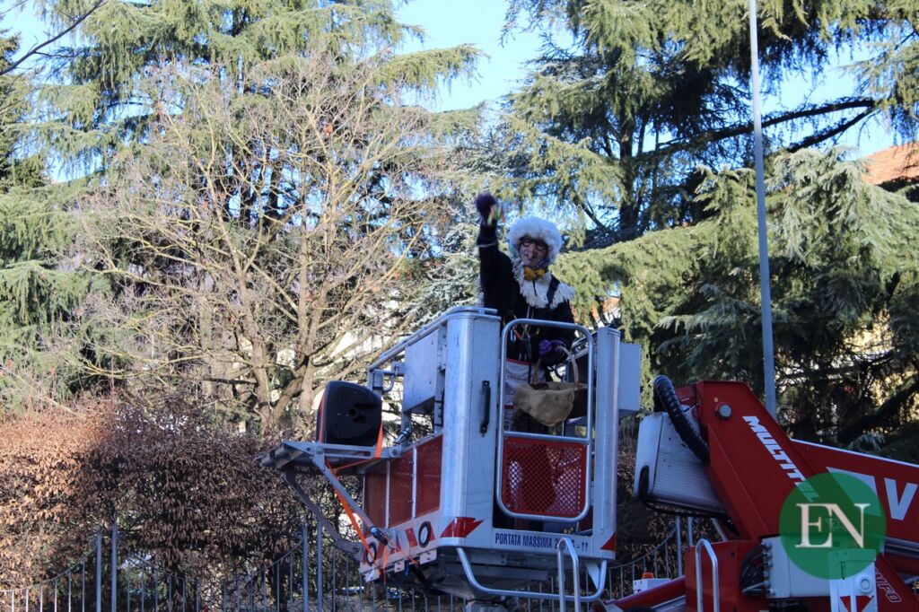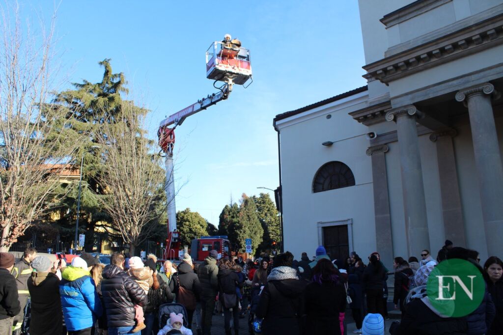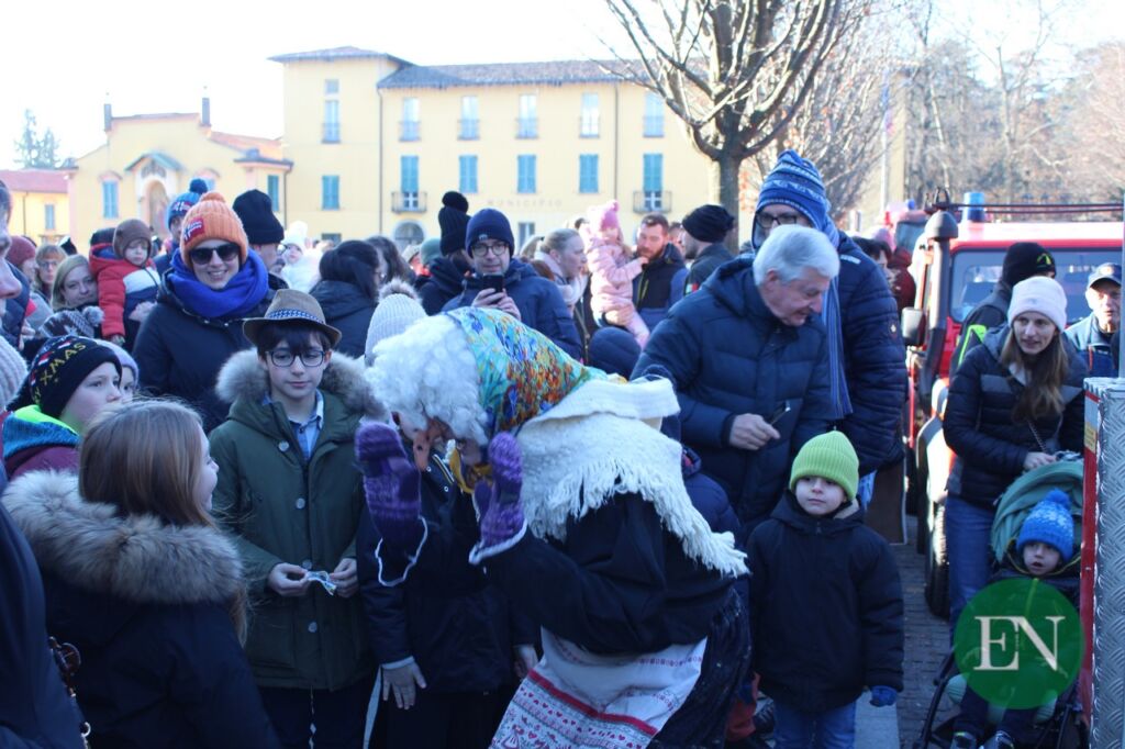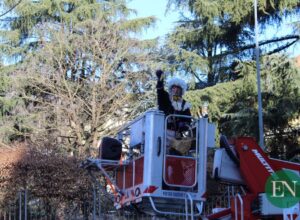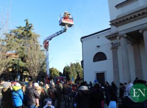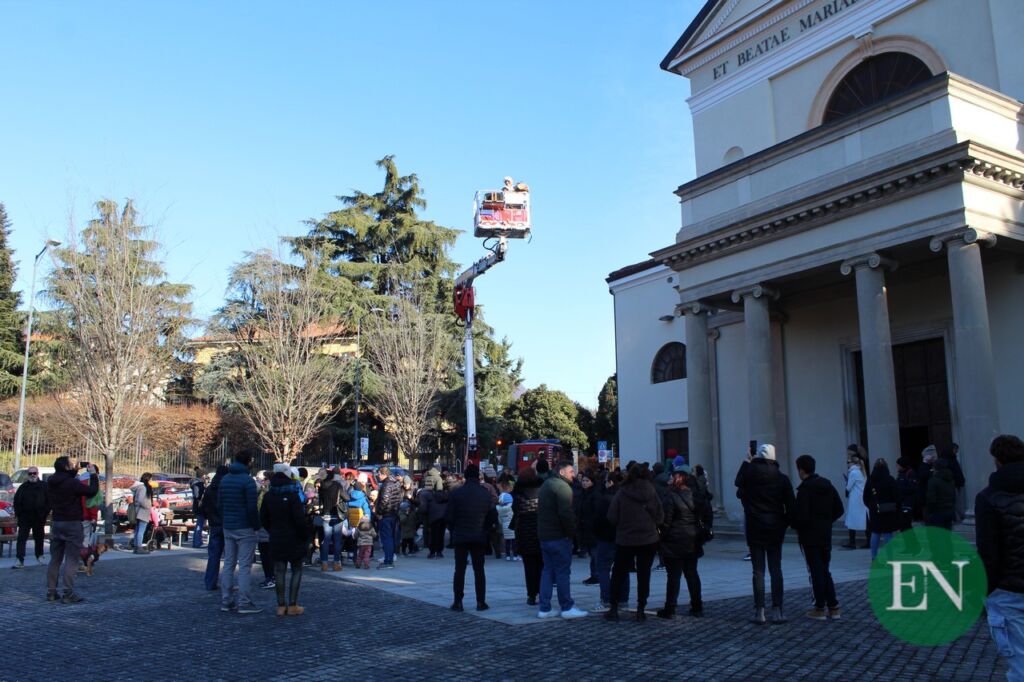 ERBA – Grande entusiasmo per il consueto appuntamento in piazza con la Befana dei Vigili del Fuoco di Erba che come da tradizione, con le calze tutte e col cappello alla romana a bordo della sua scopa, ha distribuito dolcetti e caramelle ai bambini presenti in piazza Prepositurale. Prima ad altezza uomo e poi è salita cielo grazie all’Autogru e da lassù ha lanciato altri dolciumi verso la piazza colma di persone.