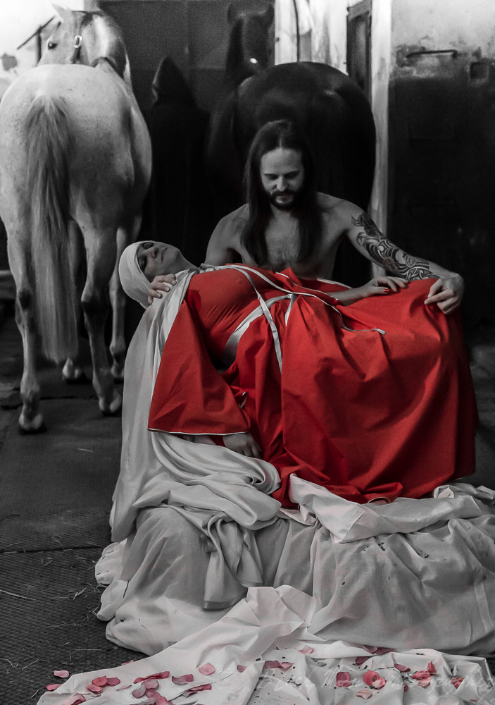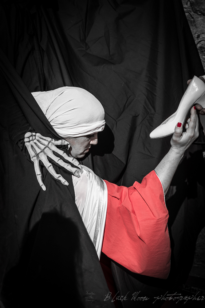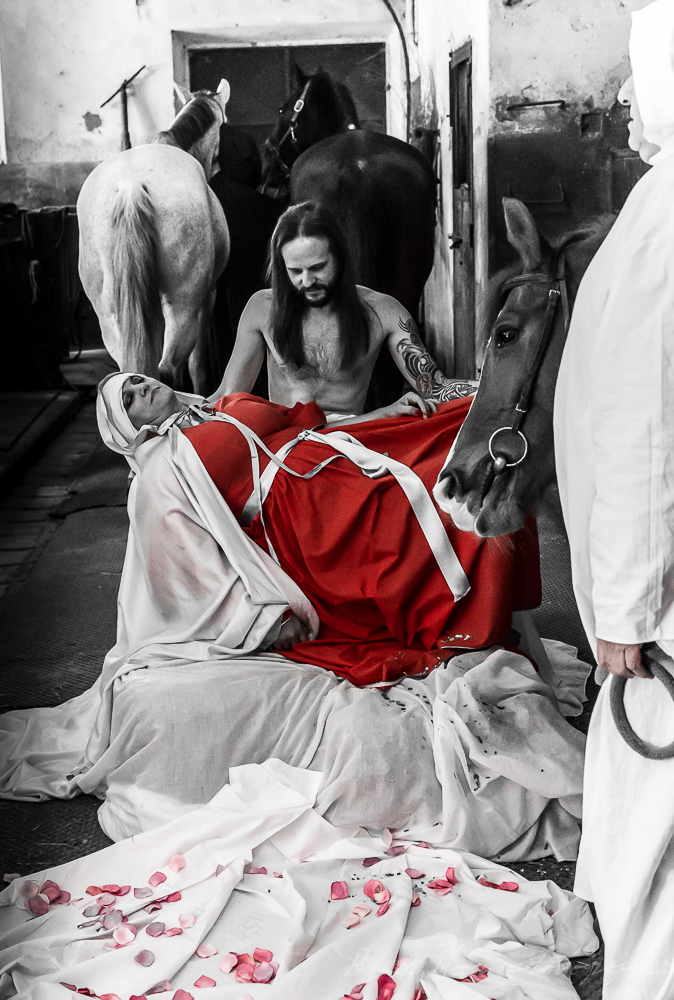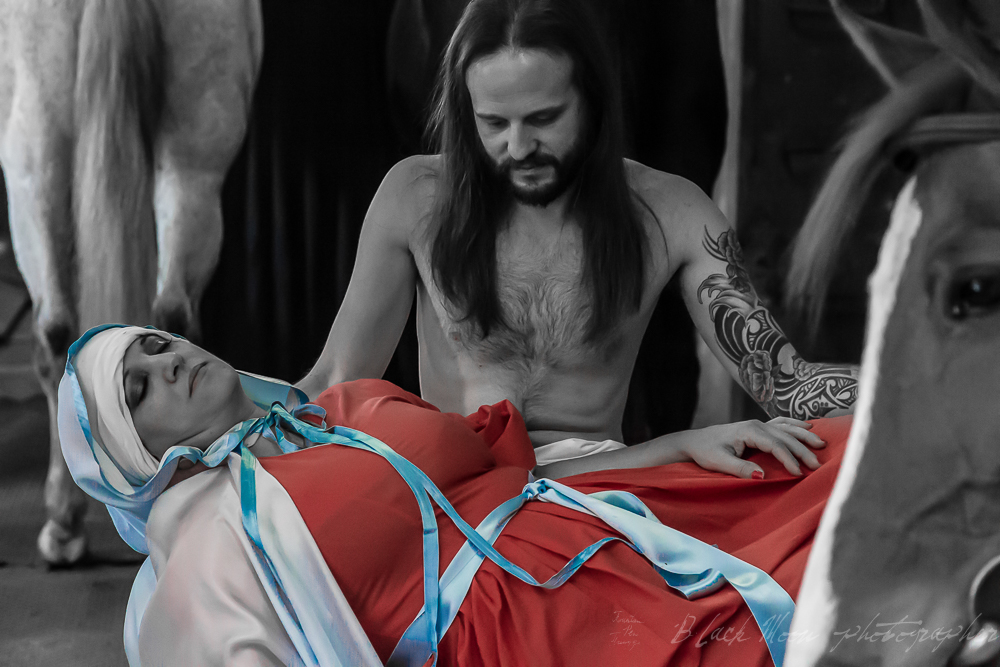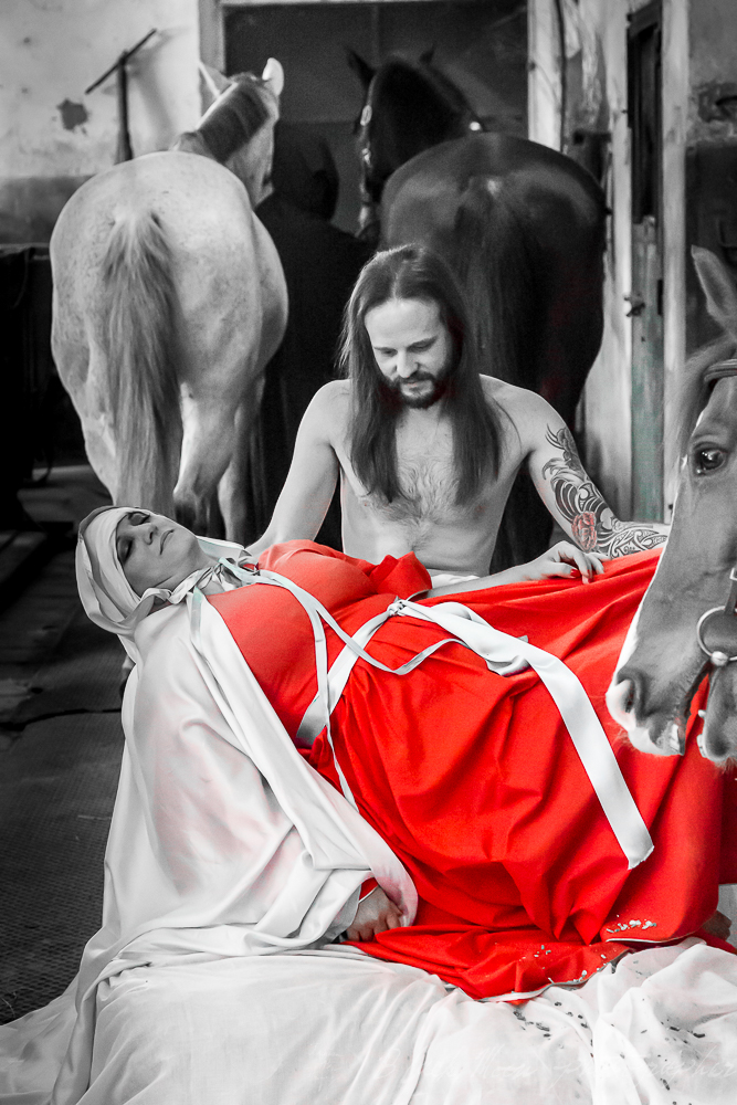 Certamente una Pietà invertita, dai toni forti, dai simboli, come le scarpette, che ora sono bianche, ora rosse, ora nere a voler rimarcare le diversità femminili e tra queste, quelle donne, che sono cadute nelle mani dei loro carnefici, Le figure dell’Angelo e della Morte sempre vicine e costanti nel cammino di ogni uomo, in senso lato, come a sottolineare il bene e il male sempre sulla stessa linea, che si tiene per mano. I cavalli semplicemente metafora maschile, di possenza e potenza, ma al contempo maestosità e bellezza, che spesso negli umani è ingannevole, ed ecco il cadere delle donne nelle trappole mortali.