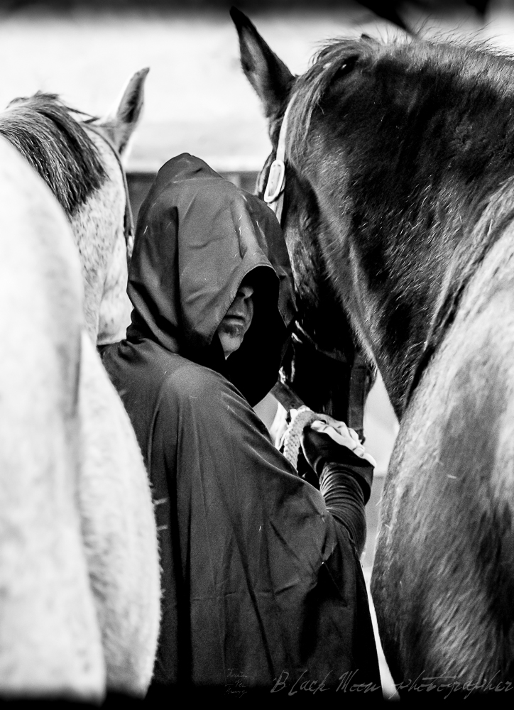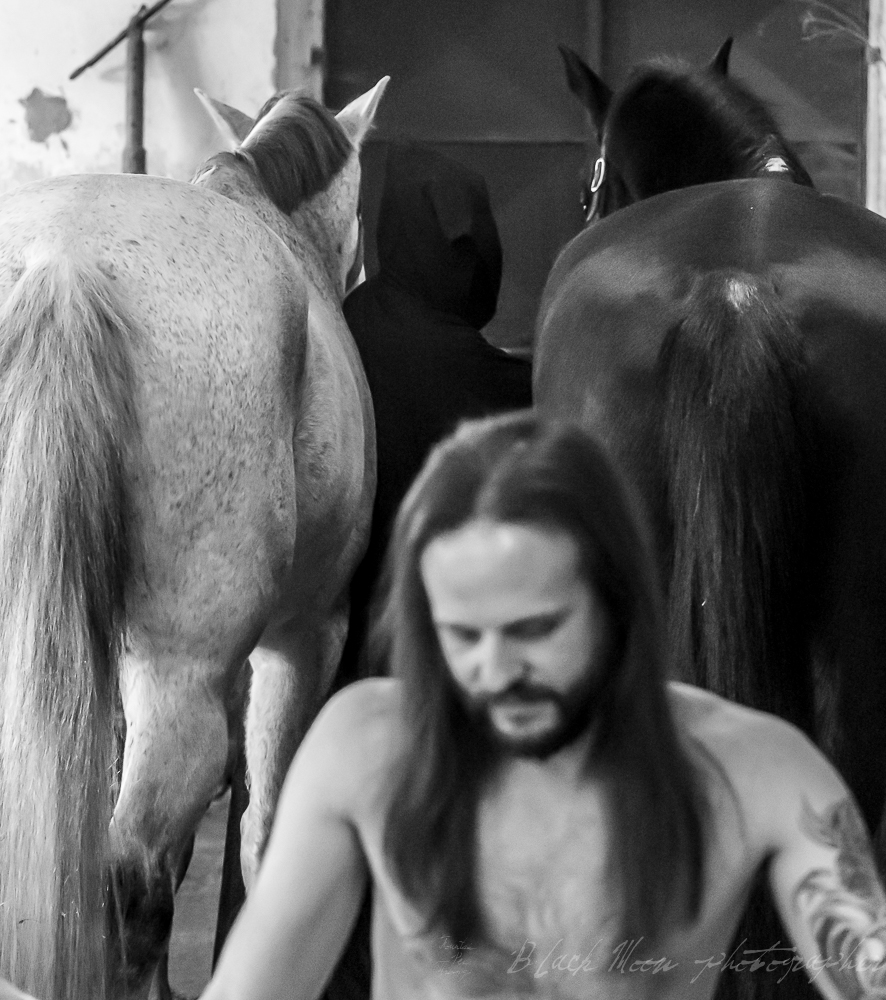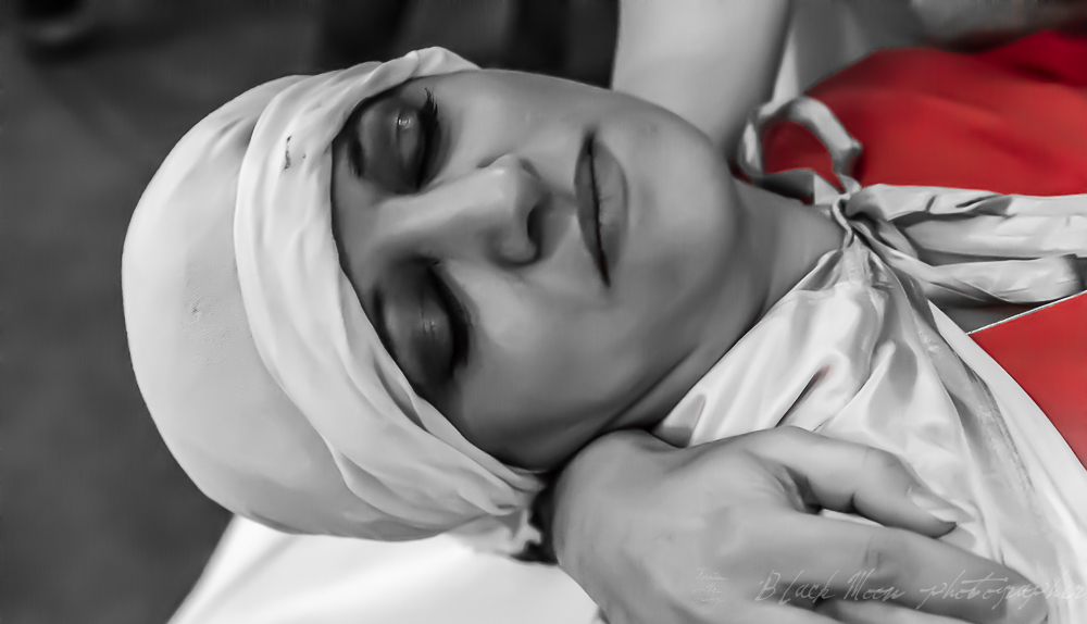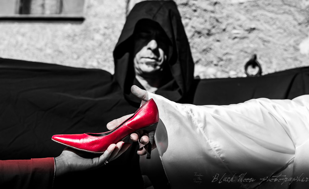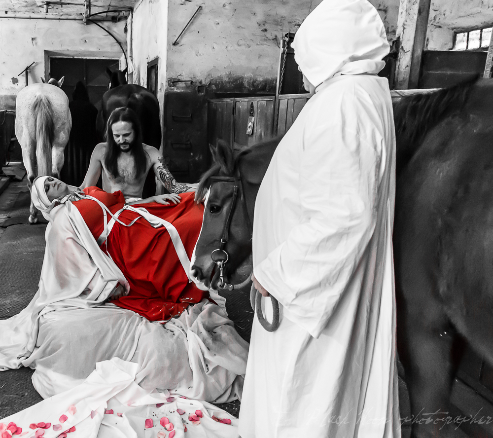 Certamente una Pietà invertita, dai toni forti, dai simboli, come le scarpette, che ora sono bianche, ora rosse, ora nere a voler rimarcare le diversità femminili e tra queste, quelle donne, che sono cadute nelle mani dei loro carnefici, Le figure dell’Angelo e della Morte sempre vicine e costanti nel cammino di ogni uomo, in senso lato, come a sottolineare il bene e il male sempre sulla stessa linea, che si tiene per mano. I cavalli semplicemente metafora maschile, di possenza e potenza, ma al contempo maestosità e bellezza, che spesso negli umani è ingannevole, ed ecco il cadere delle donne nelle trappole mortali.