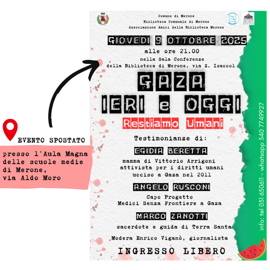 MERONE – Giovedì 9 ottobre, alle ore 21:00, presso l’Aula Magna della Scuola Media “Aldo Moro” di Merone (in Via Aldo Moro), si terrà l’incontro pubblico dal titolo “Gaza ieri e oggi: restiamo umani”, un momento di confronto e riflessione dedicato alla situazione nella Striscia di Gaza e al valore universale dell’umanità di fronte ai conflitti.