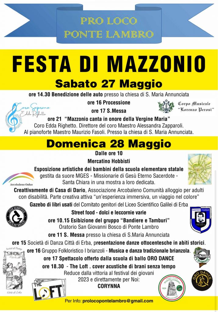 PONTE LAMBRO – La Pro Loco di Ponte Lambro organizza la Festa di Mazzonio: l’appuntamento è per il prossimo 27 e 28 maggio con tante iniziative.