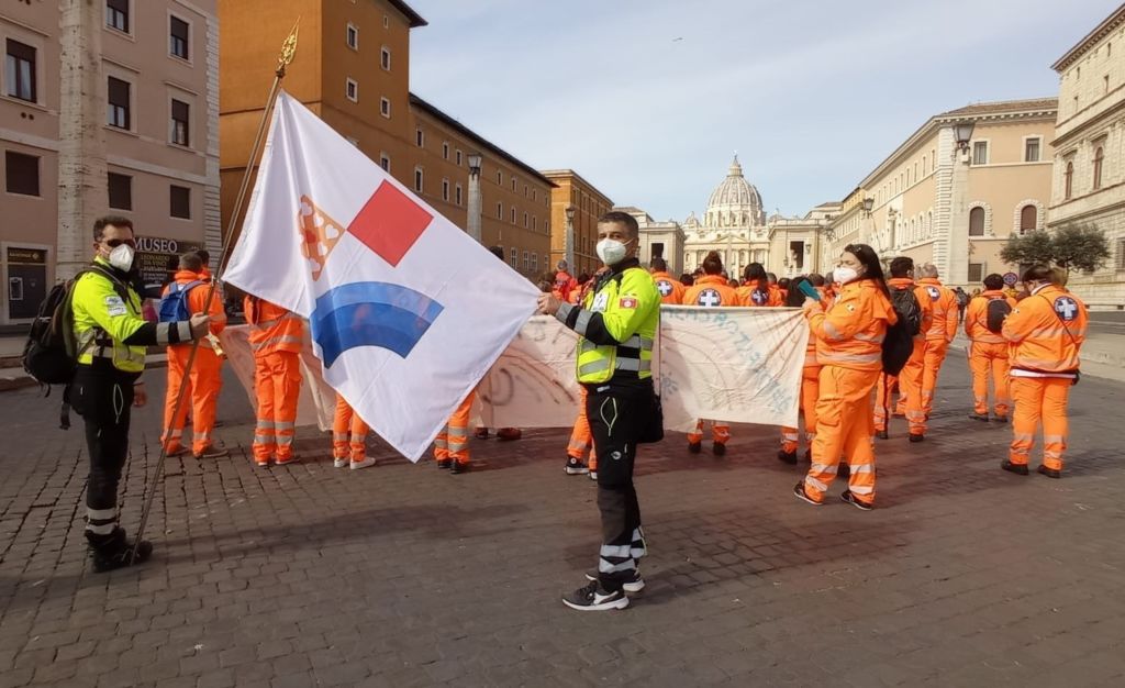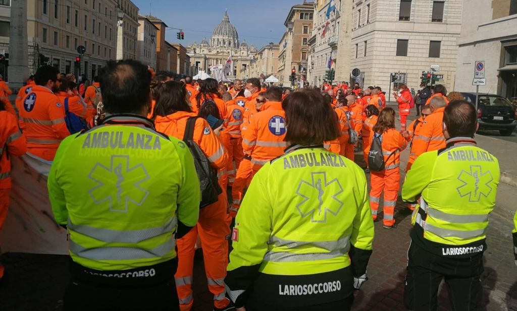 Domenica 20 oltre duemila tra soccorritori, medici, infermieri, tecnici e autisti del 118 hanno sfilato in divisa per le vie della capitale. Il corteo è partito da Via della Conciliazione fino ad arrivare in Piazza San Pietro per l’angelus di Papa Francesco. In testa alla marcia uno striscione blu con la scritta “pace” in 17 lingue diverse.