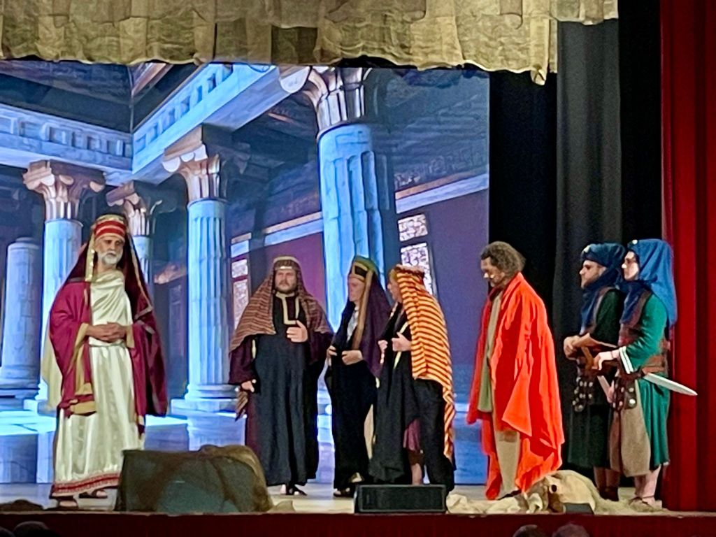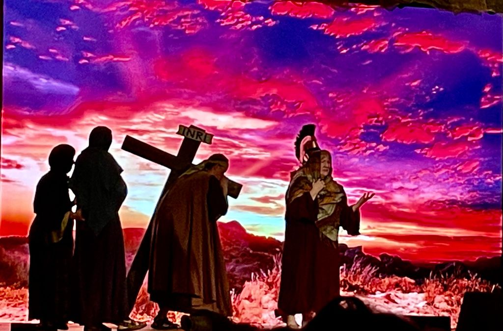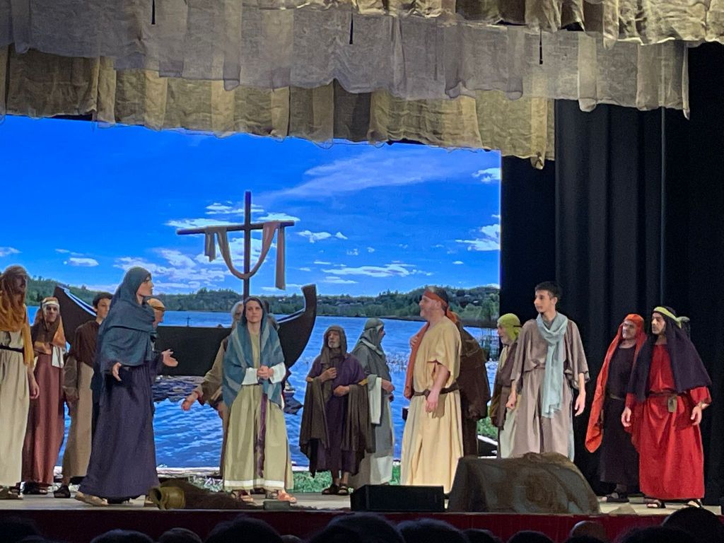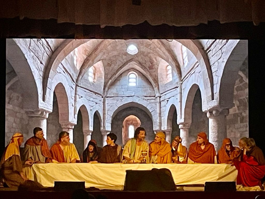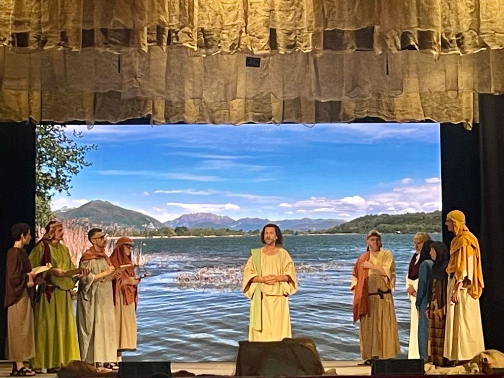 Quando le luci in platea si sono abbassate, non è stato difficile entrare nell’atmosfera della rappresentazione, in atto unico, ma divisa in tre parti tematiche: «L’Annuncio», «La Passione» e «La Chiesa». Merito di una scenografia di grande impatto, basata su immagini (alcune delle quali frutto dell’intelligenza artificiale) riprodotte sul ledwall a fondoscena, che hanno contestualizzato i vari “quadri” della vicenda. Nella prima parte, durante il racconto degli Evangelisti, il ricorso alla tecnologia multimediale – ottimamente diretta dal banco di regia – ha consentito anche di proiettare scene fotografate e filmate realizzate nel nostro territorio per rievocare alcuni passaggi della vita di Cristo: la chiamata degli apostoli sul Mar di Galilea (il lago di Alserio), il Discorso delle Beatitudini (le alture alle spalle di Crevenna), l’ingresso in Gerusalemme (il borgo di Villincino) e così via.