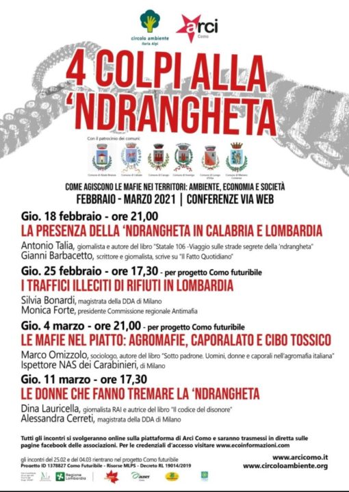 La Rassegna “4 colpi alla ‘ndrangheta” è organizzata dal Circolo Ambiente “Ilaria Alpi” e dall’Arci Como, col patrocinio dei Comuni di Alzate Brianza, Cabiate, Carugo, Inverigo, Lurago d’Erba e Mariano Comense.
