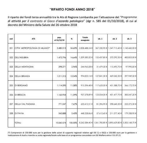 La delibera conferma in carico alle Agenzie di tutela della salute (Ats) la continuazione degli interventi del Programma e i piani locali di Gioco d’azzardo patologico (Gap). Approva inoltre il riparto dei fondi 2018, pari a 8.262.584 euro, secondo il criterio della popolazione residente in ciascun territorio Ats.
