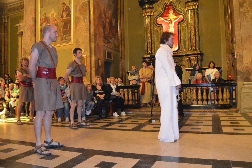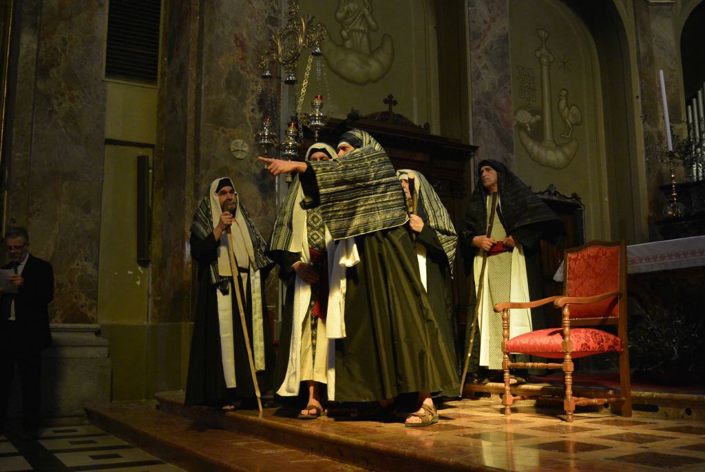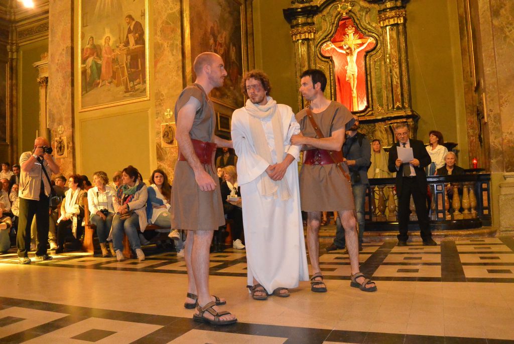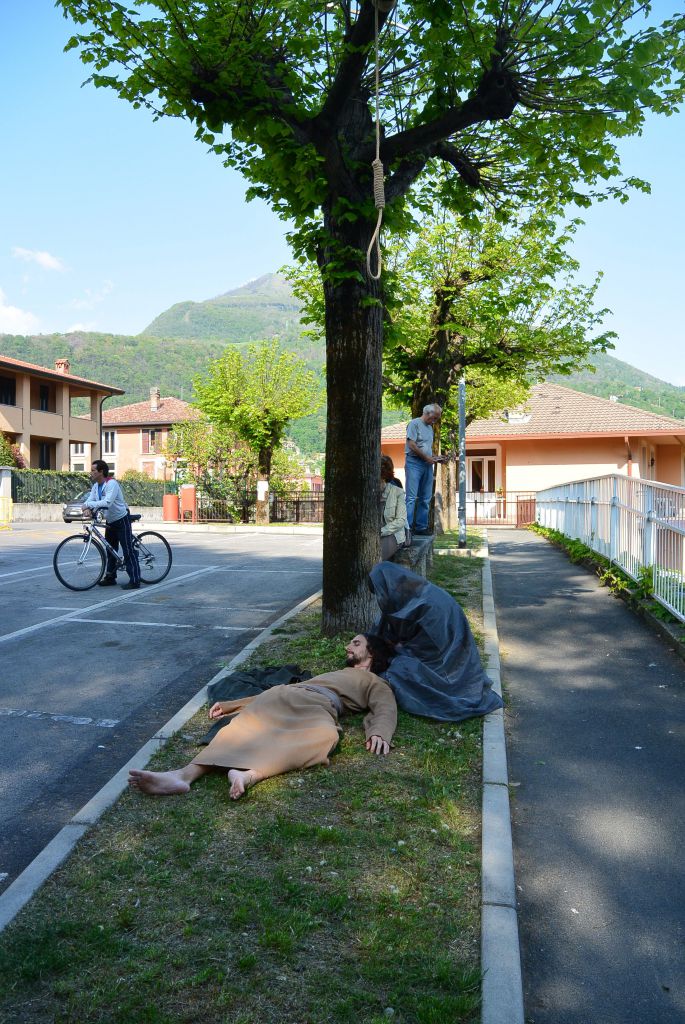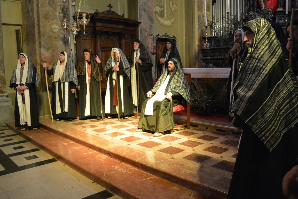 Gli attori, un centinaio tra comparse locali e qualche professionista, hanno condotto il pubblico in un percorso fatto di 9 tappe dislocate per le strade di Eupilio, dalla chiesa di San Giorgio in Corneno fino ai padri barnabiti: sinedrio, ultima cena, getsemani, Pilato, Erode, prima, seconda e terza caduta e crocifissione.