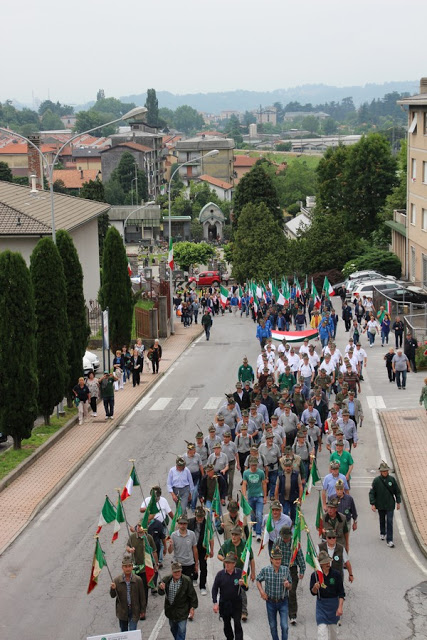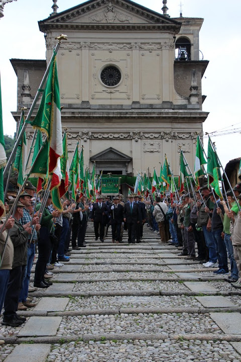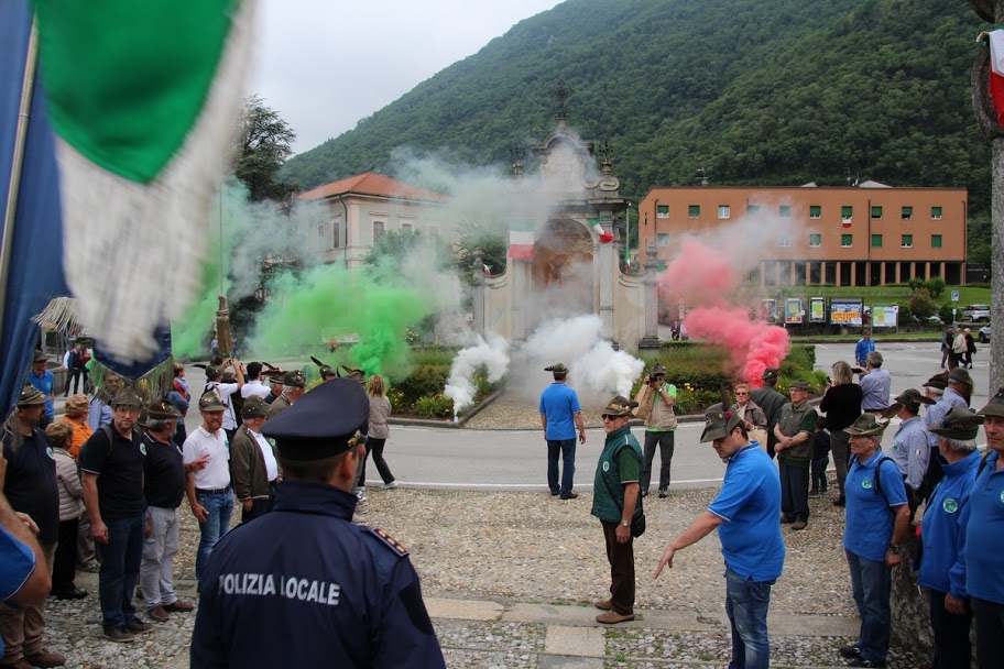 Il cerimoniere e responsabile di zona, Tiziano Tavecchio, ha infine disposto sulla stupenda scalinata della chiesa i Gonfaloni, i Vessilli ospiti e i Gagliardetti per gli onori finali al Vessillo Sezionale e ai Gonfaloni dei tre paesi. Sorpresa finale: fumogeni tricolori alla base della scalinata con canto Sventola il Tricolore intonato e suonato dalla Fanfara di Olgiate Comasco.