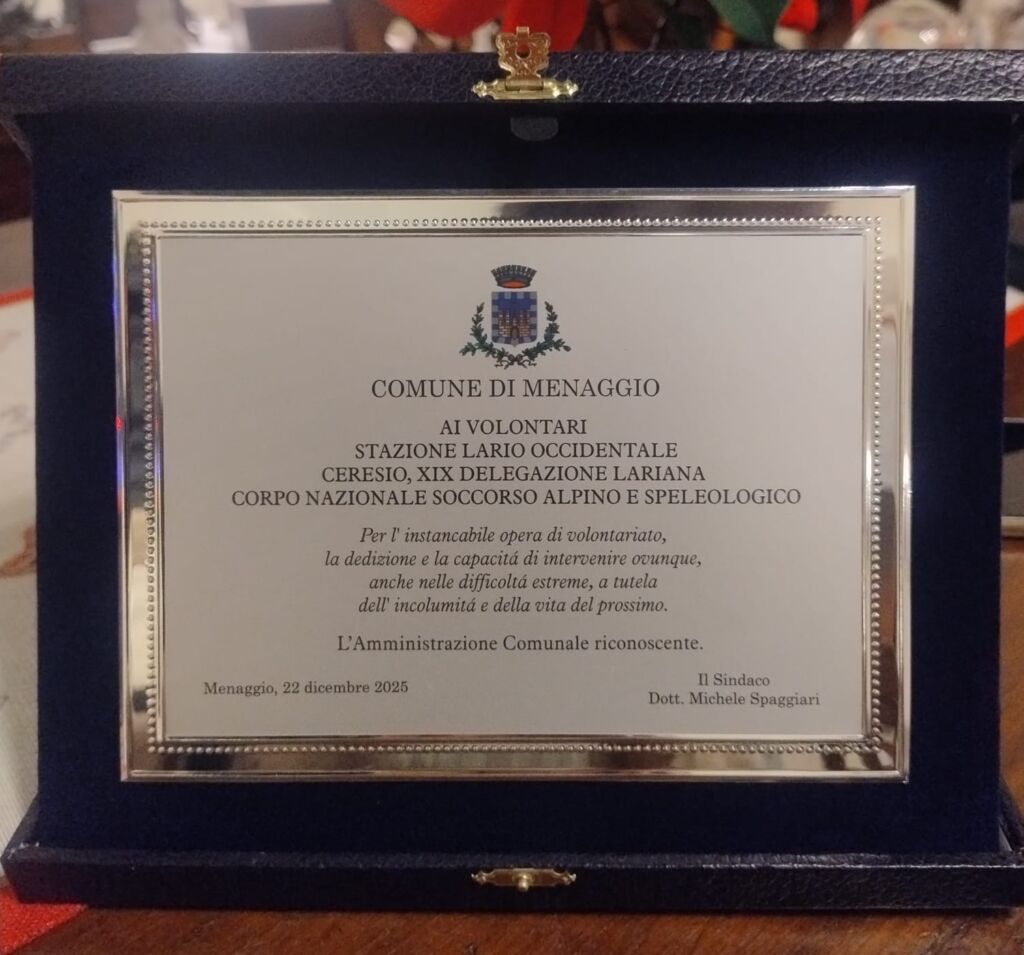 Un secondo riconoscimento è arrivato la sera di lunedì 22 dicembre da Menaggio. Il sindaco Michele Spaggiari, a nome dell’amministrazione comunale, ha conferito una targa ai volontari della Stazione Lario Occidentale – Ceresio, XIX Delegazione Lariana, con queste parole: “Ai volontari Stazione Lario Occidentale – Ceresio, XIX Delegazione Lariana. Per l’instancabile opera di volontariato, la dedizione e la capacità di intervenire ovunque, anche nelle difficoltà estreme, a tutela dell’incolumità e della vita del prossimo. L’Amministrazione Comunale riconoscente”. Un riconoscimento che assume un significato particolare se si considera che una parte rilevante degli interventi della Stazione interessa proprio le montagne alle spalle del territorio di Menaggio.