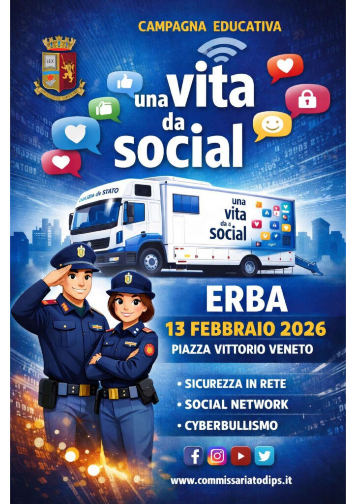 ERBA – La Polizia di Stato torna in piazza a Erba con “Una vita da Social”, la campagna itinerante di educazione alla legalità promossa insieme al Ministero dell’Istruzione e del Merito nell’ambito del progetto “Generazioni Connesse”. Un’iniziativa che porta sul territorio un percorso di sensibilizzazione sui rischi del mondo digitale e sull’uso consapevole della tecnologia, rivolto in particolare agli studenti.