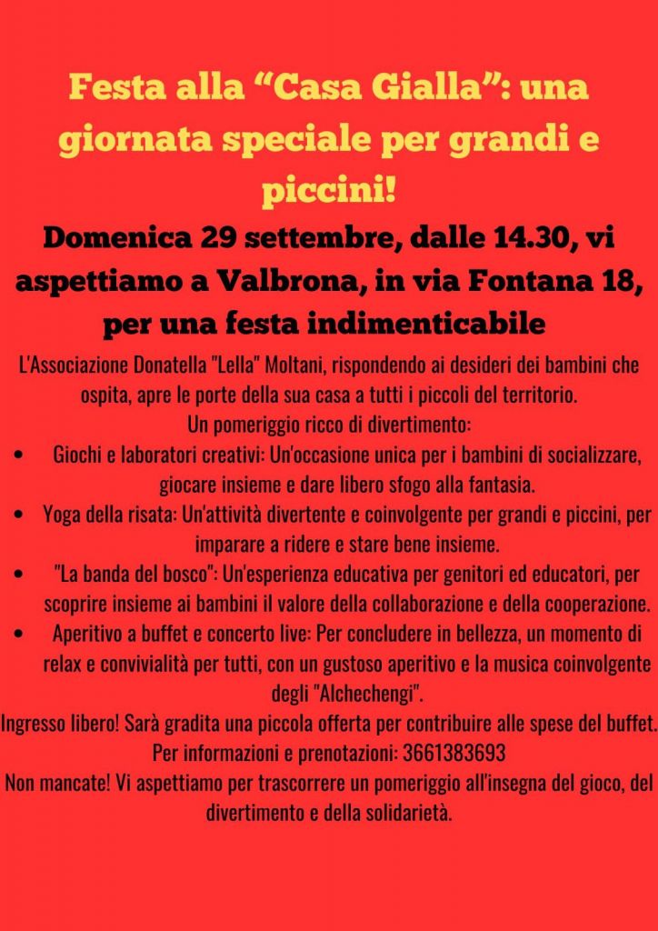 VALBRONA – L’Associazione Donatella “Lella” Moltani aprirà le porte della propria casa affinché i bambini e le mamme richiedenti asilo possano farsi conoscere dalla comunità locale. Sono stati i bambini a volere questo festa ed intitolarla “La Festa della Casa Gialla” che si terrà nel pomeriggio di domenica 29 settembre.