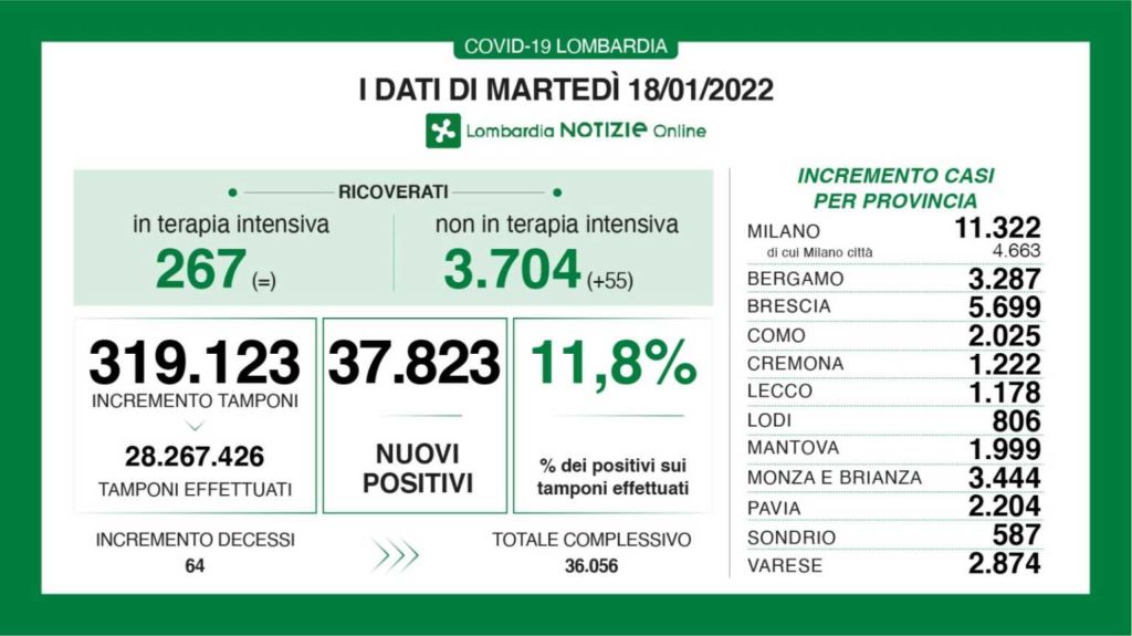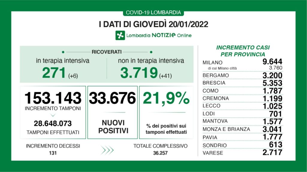 Covid, i dati del 20 gennaio. 33.676 nuovi casi, 1.787 nel comasco