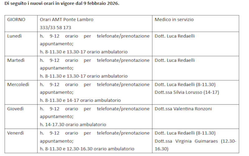 Sul fronte dell’assistenza territoriale, è stato intanto attivato un Ambulatorio Medico Temporaneo a Ponte Lambro, nella Casa di Comunità di via Verdi 3, dedicato agli ex assistiti dei dottori Pontiggia, Rivolta Francesco, Alberghina, Carlini e Polti. Il servizio garantisce tutte le prestazioni di competenza del medico di medicina generale, dalle prescrizioni alle visite e ai permessi di lavoro. Il numero di riferimento per fissare gli appuntamenti è il 333/33 58 173. I nuovi orari dell’ambulatorio sono entrati in vigore dal 9 febbraio 2026.