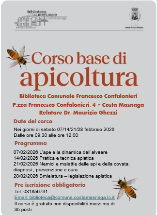 Il corso base di apicoltura si terrà nel prossimo mese di febbraio presso UNITRE di Meda e alla Biblioteca Comunale di Costa Masnaga, dove l’iniziativa è giunta alla sesta edizione grazie al costante interesse del pubblico.