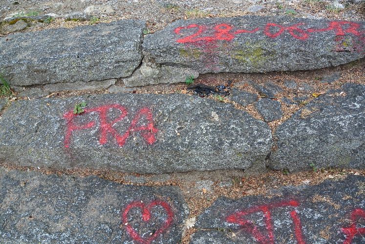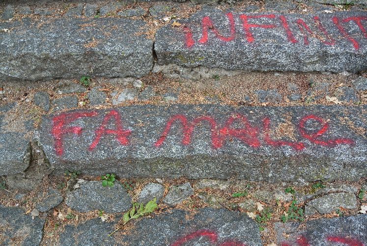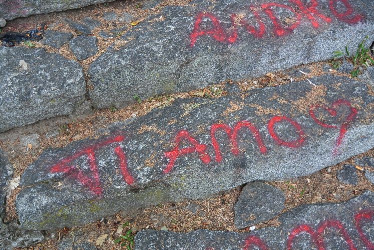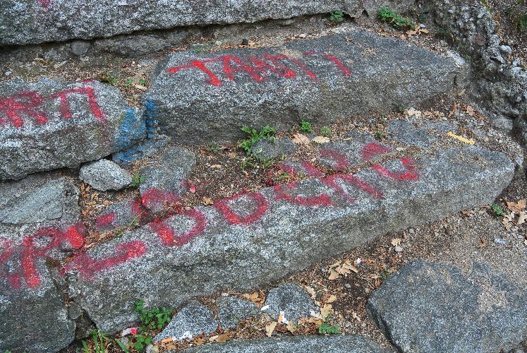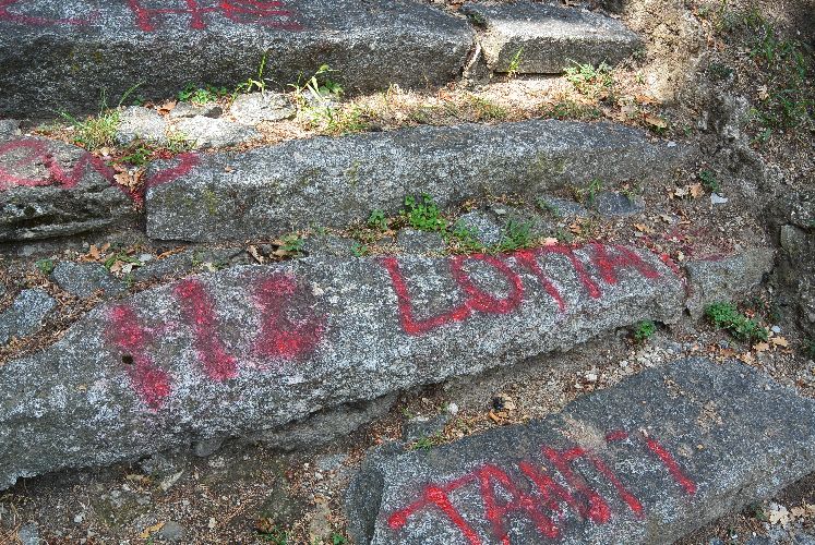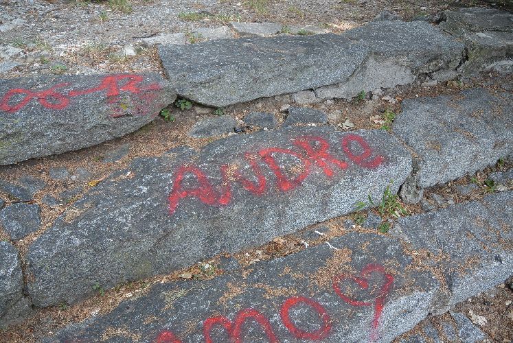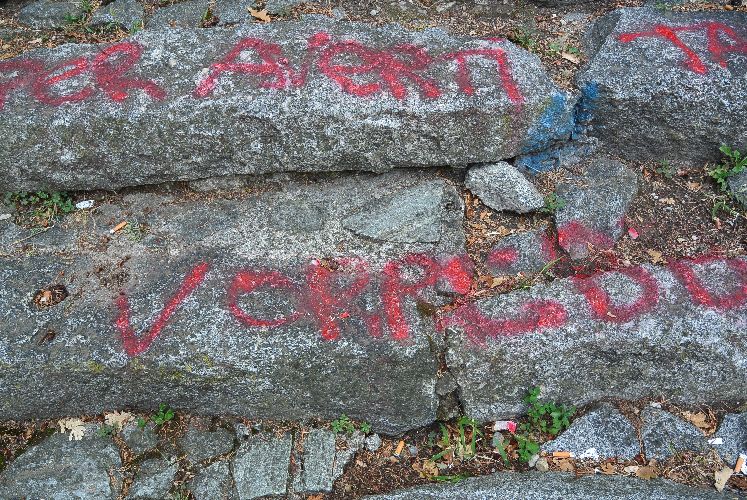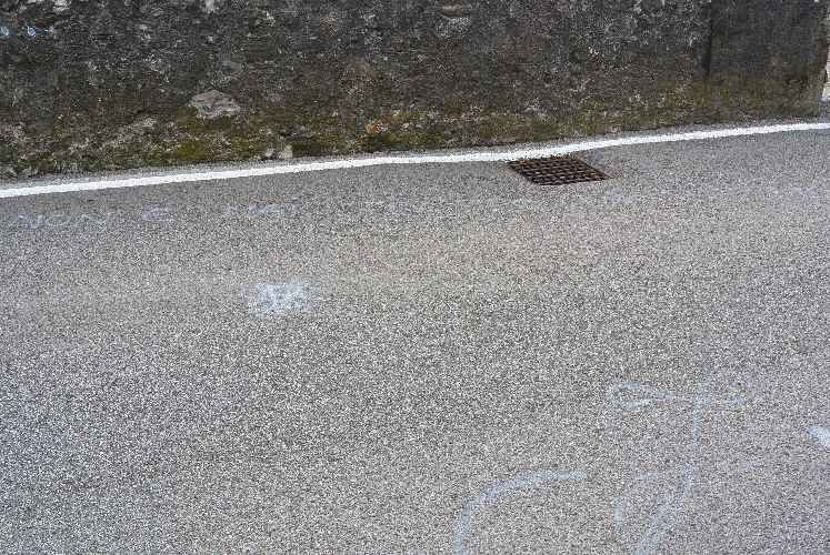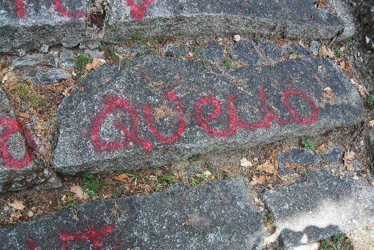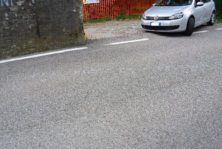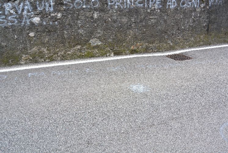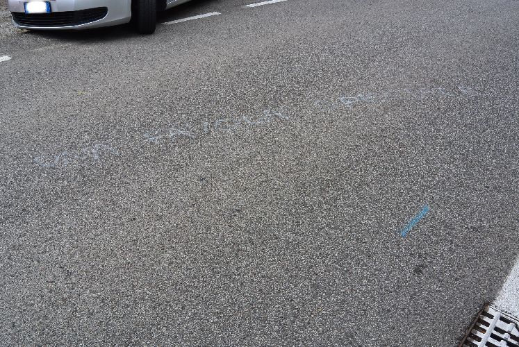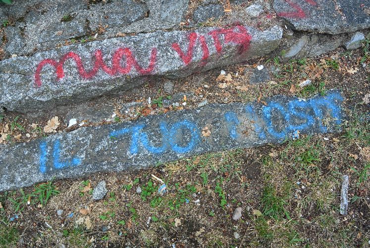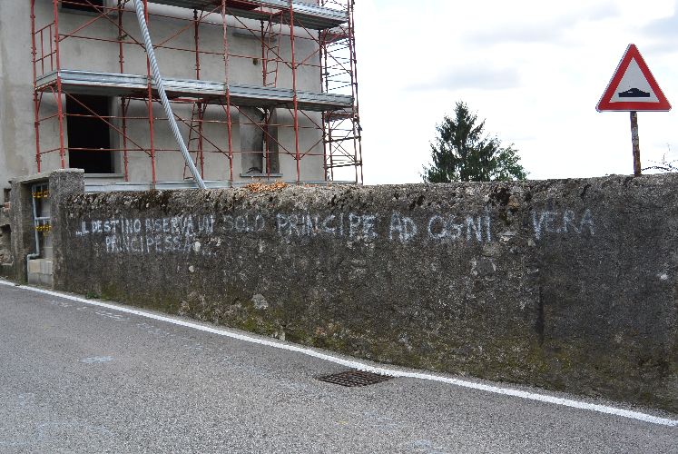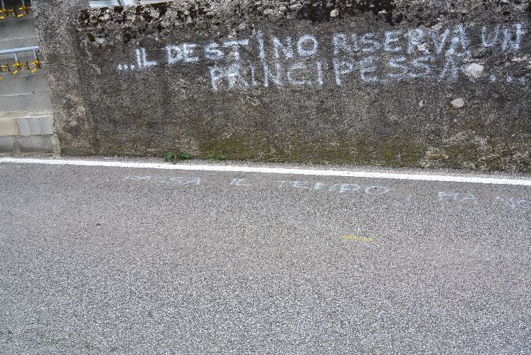 Il secondo writer, invece, ha scelto un muretto e l’asfalto di via Marconi probabilmente in un tentativo di riconquista (“Passa il tempo, ma non è mai troppo tardi per ricostruire una favola speciale”).