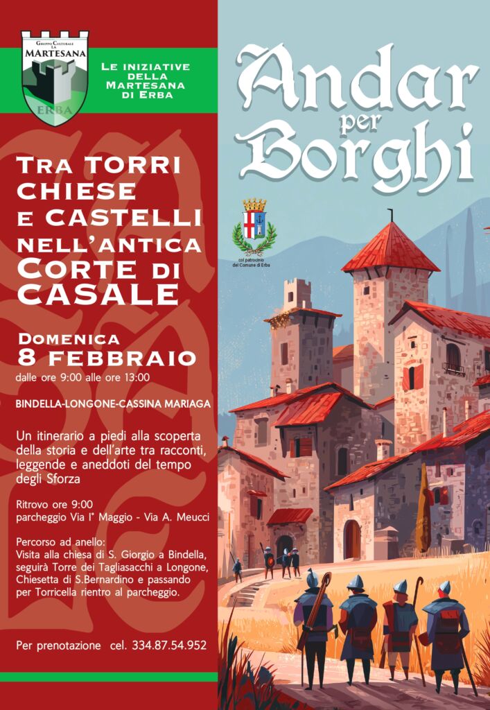 ERBA – Un percorso tra storia, arte e memoria locale, pensato per riscoprire angoli e vicende della Martesana erbese. È questo il cuore dell’iniziativa promossa dal Gruppo culturale La Martesana di Erba, che propone “Tra torri chiese e castelli nell’antica corte di Casale”, un itinerario a piedi che si inserisce nel ciclo di appuntamenti “Andar per borghi”, con il patrocinio del Comune di Erba.