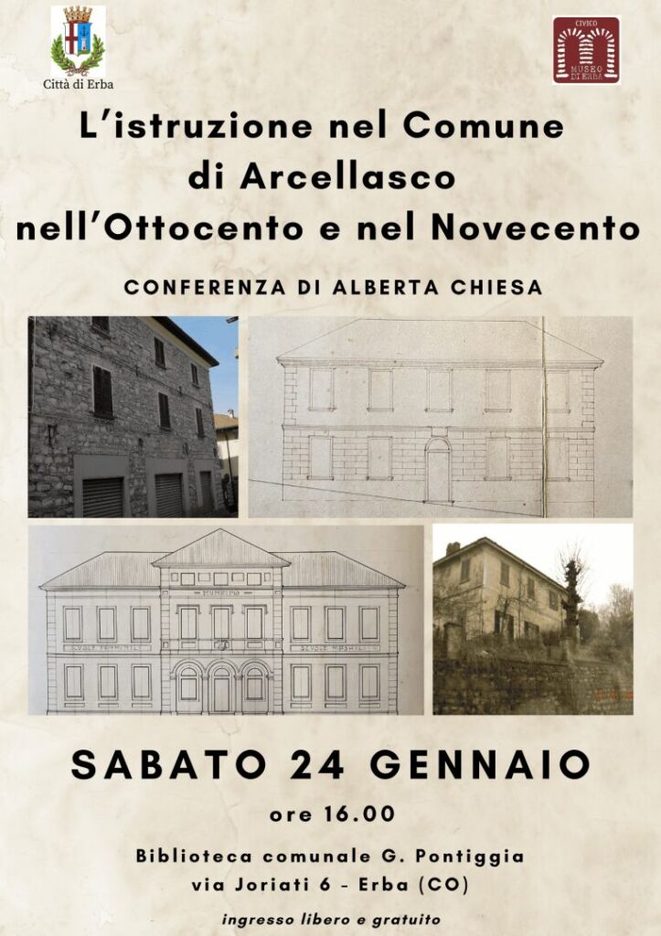 Al centro dell’intervento ci sarà l’antico Comune di Arcellasco, oggetto di uno studio specifico pubblicato sulla rivista Quaderni Erbesi 2024. Per ricostruire le condizioni e l’evoluzione delle scuole locali, la relatrice ha condotto un lavoro di ricerca basato sui fondi dell’Archivio Storico Comunale di Erba, una documentazione definita ricca di materiali significativi. Atti, registri e carte non solo permettono di seguire lo sviluppo dell’istruzione tra Ottocento e primo Novecento, ma offrono anche uno spaccato della più ampia realtà socioeconomica del Comune in quel periodo.