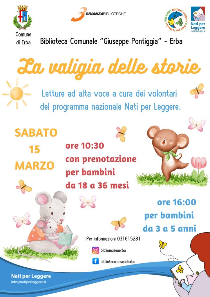 ERBA – La biblioteca Pontiggia di Erba propone un doppio appuntamento dedicato ai bambini. Il primo si inserisce all’interno della rassegna “La valigia delle storie” e si terrà sabato 15 marzo: alle ore 10:30 per bambini 18-36 mesi dove è necessaria la prenotazione e alle ore 16.00 per bambini 3-5 anni dove non serve prenotare. I più piccoli potranno così ascoltare letture ad alta voce a cura dei volontari del programma nazionale Nati per Leggere.