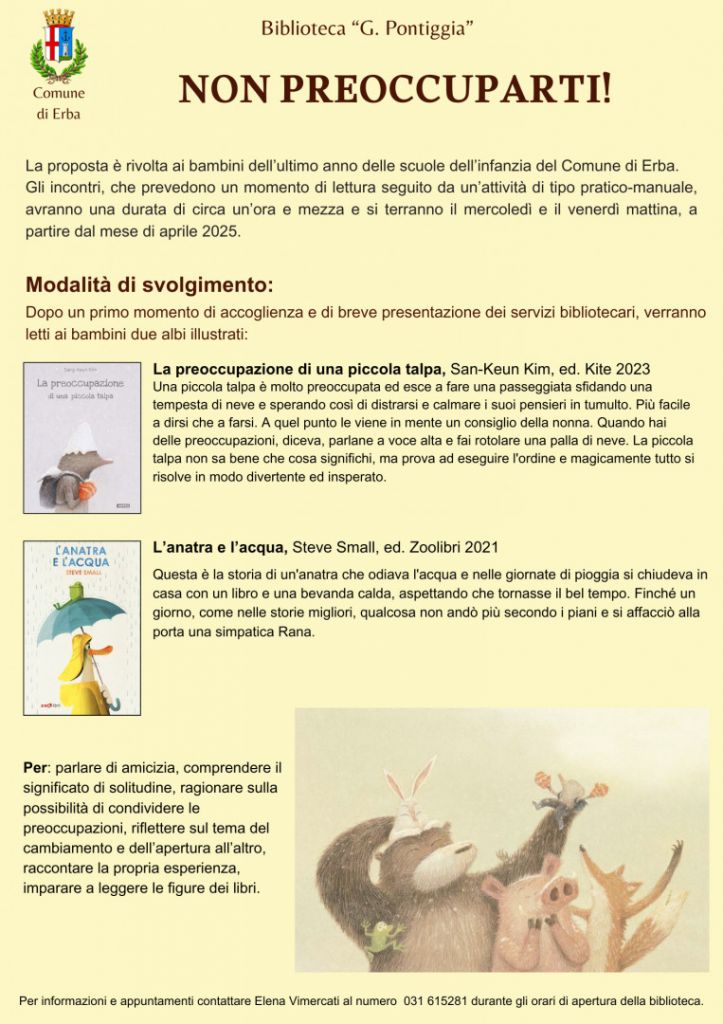 Il secondo appuntamento è una rassegna che si svolgerà ogni mercoledì e venerdì mattina a partire dal mese di aprile e s’intitola “Non Preoccuparti“. La proposta è rivolta alle classi dell’ultimo anno delle scuole dell’infanzia del Comune di Erba. Gli incontri prevedono un momento di lettura seguito da un’attività di tipo pratico-manuale e avranno durata di un’ora e mezza.