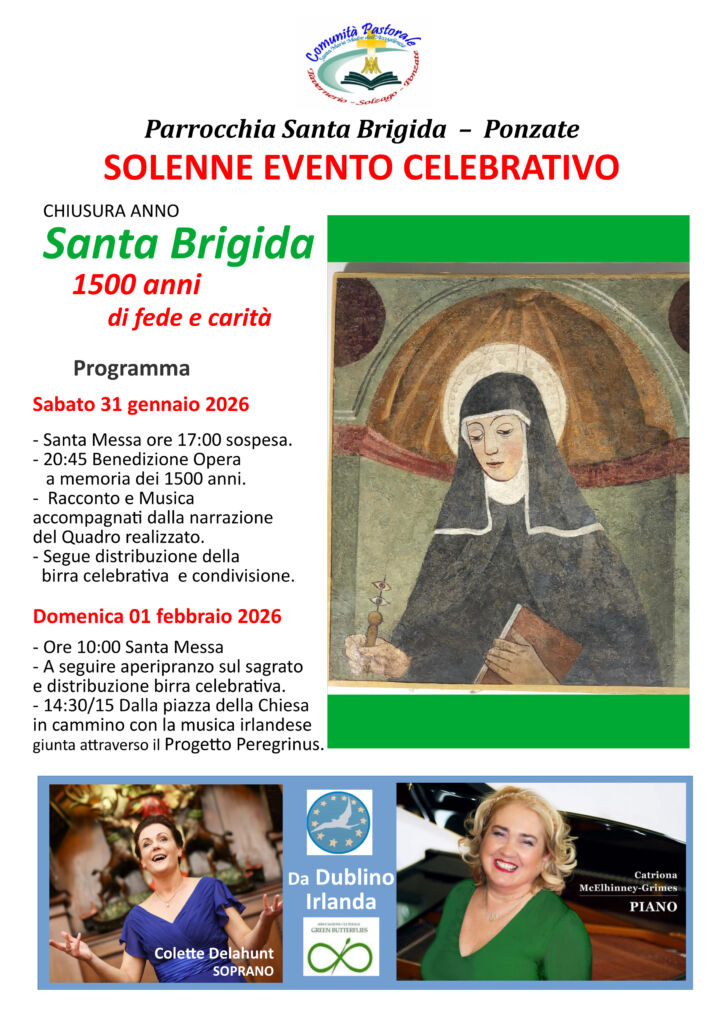 TAVERNERIO – Un fine settimana di musica, arte e spiritualità per salutare la chiusura del XV centenario di Santa Brigida d’Irlanda, patrona della comunità di Ponzate a Tavernerio. La frazione sarà al centro di un articolato programma celebrativo che intreccia dimensione religiosa e culturale, rafforzando idealmente il legame tra Italia e Irlanda.