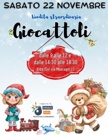 ERBA – Nell’ambito dell’esposizione natalizia del mercatino dell’usato solidale Trapeiros di Emmaus che durerà fino a gennaio, sabato 22 novembre si terrà una vendita straordinaria di giocattoli dalle 9 alle 12 e dalle 14:30 alle 18:30.