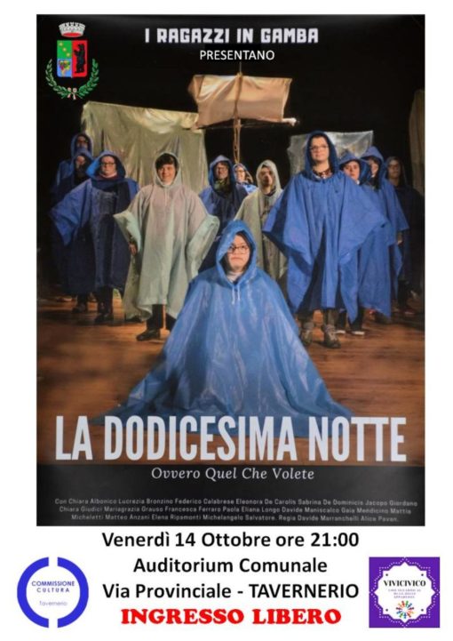 TAVERNERIO – “La dodicesima Notte”, questo il titolo dello spettacolo a cura della compagnia teatrale “Ragazzi in gamba” e promosso dalla Commissione Cultura del Comune di Tavernerio.