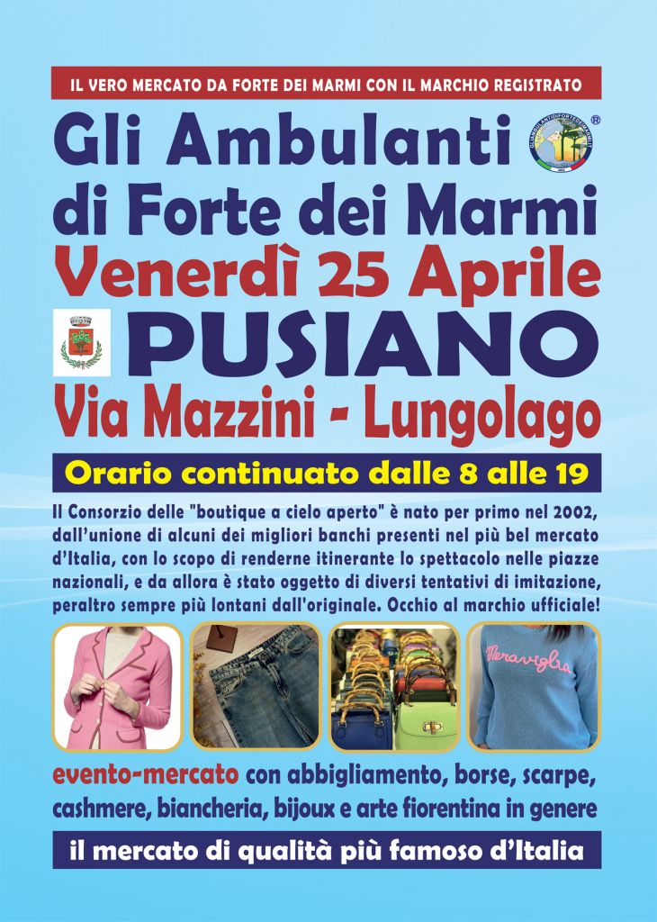 M.P. – Gli Ambulanti di Forte dei Marmi: le bancarelle del mercato di qualità più famoso d’Italia tornano finalmente, e a grande richiesta, nel Comasco con tutto il meglio del Made in Italy artigianale e le ultime tendenze della moda. Con l’aria di primavera, si potranno ammirare di nuovo le ormai mitiche “boutique a cielo aperto” dell’originale Consorzio il giorno della Liberazione, venerdì 25 aprile, a PUSIANO, sull’incantevole Lungolago di Via Mazzini, in una manifestazione patrocinata dall’amministrazione comunale. Dunque, un’occasione da non perdere assolutamente per i tanti appassionati del genere, che l’hanno a lungo reclamata, come sempre all’insegna dello shopping più glamour e conveniente, con orario continuato, anche in caso di maltempo, dalle 8 alle 19.